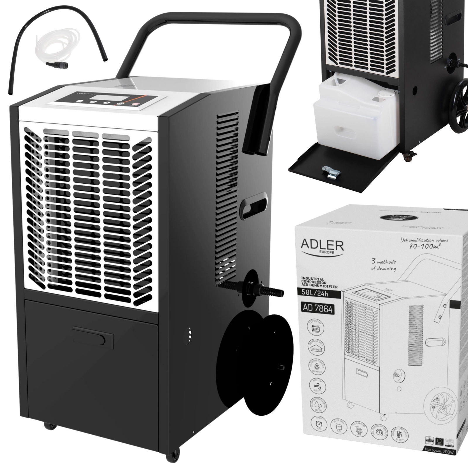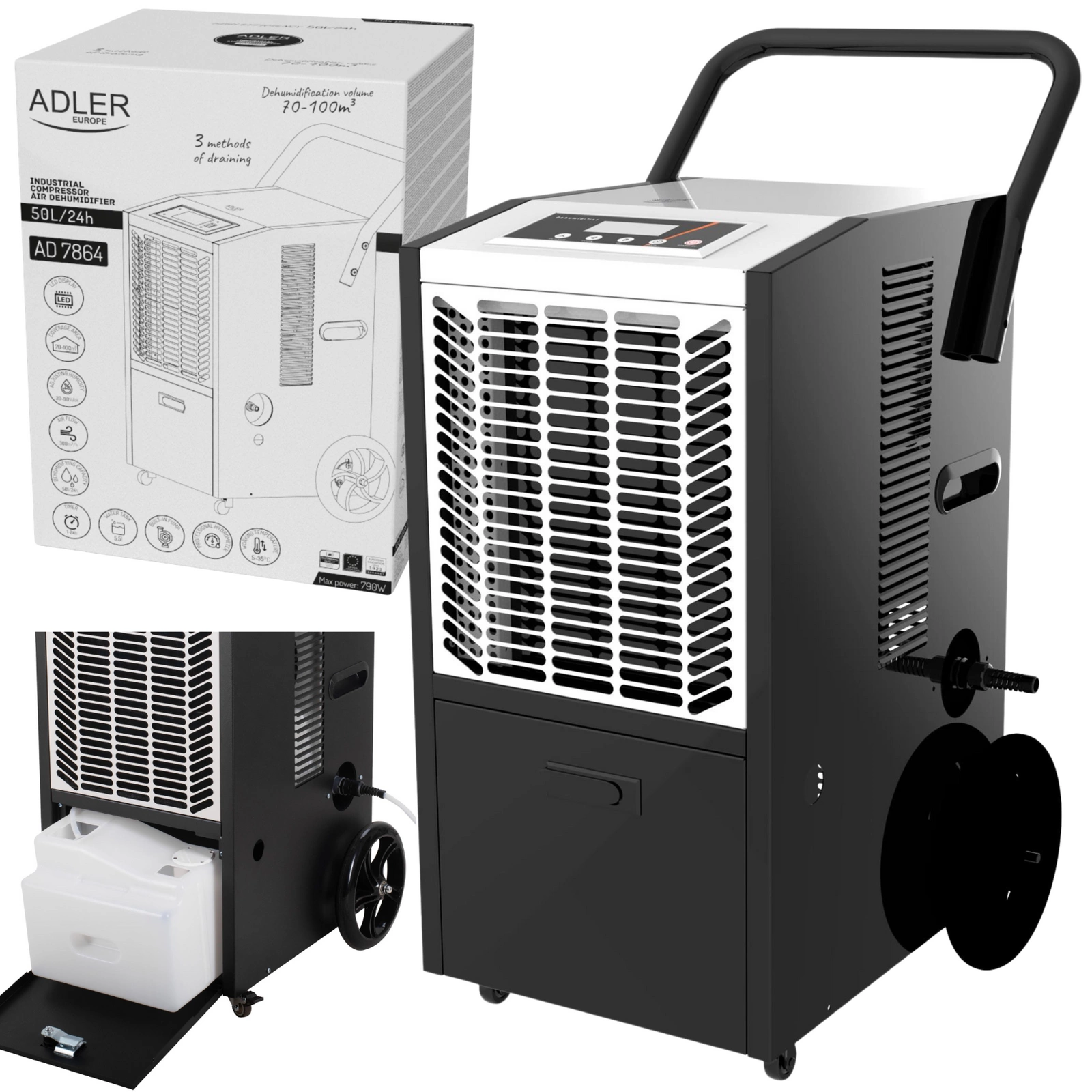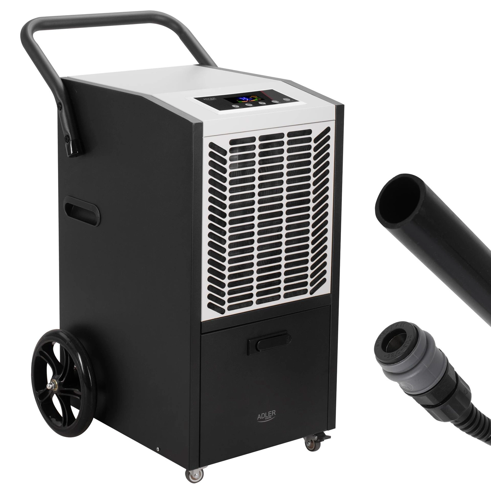 Przemysłowy osuszacz powietrza 50L/24h, 300 m³/h, pompa, LED Adler AD 7864
