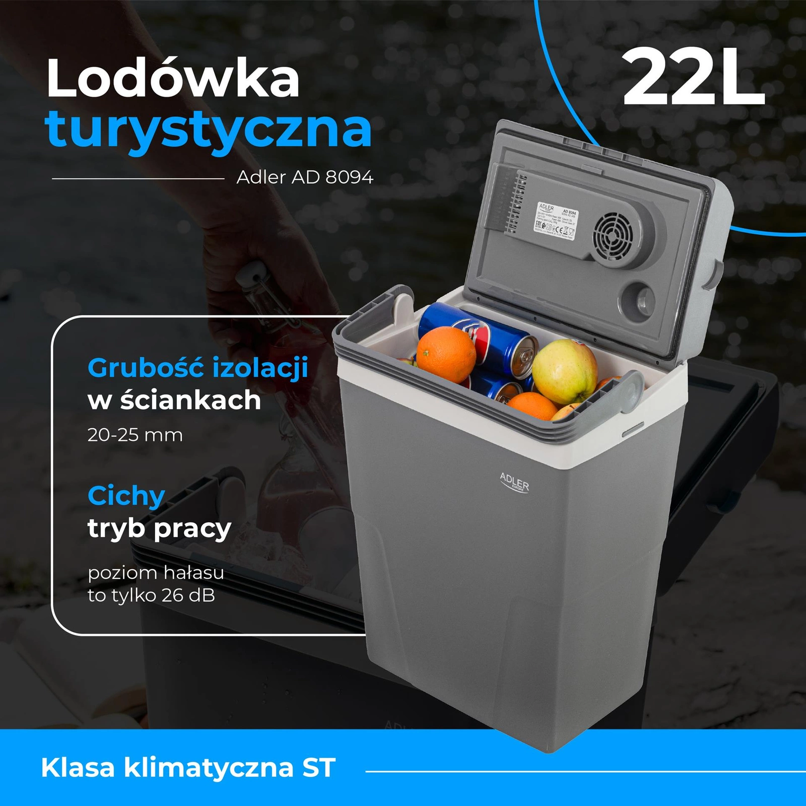 Mini lodówka turystyczna 22L, podwójne zasilanie, ergonomiczna, energooszczędna, Adler AD 8094