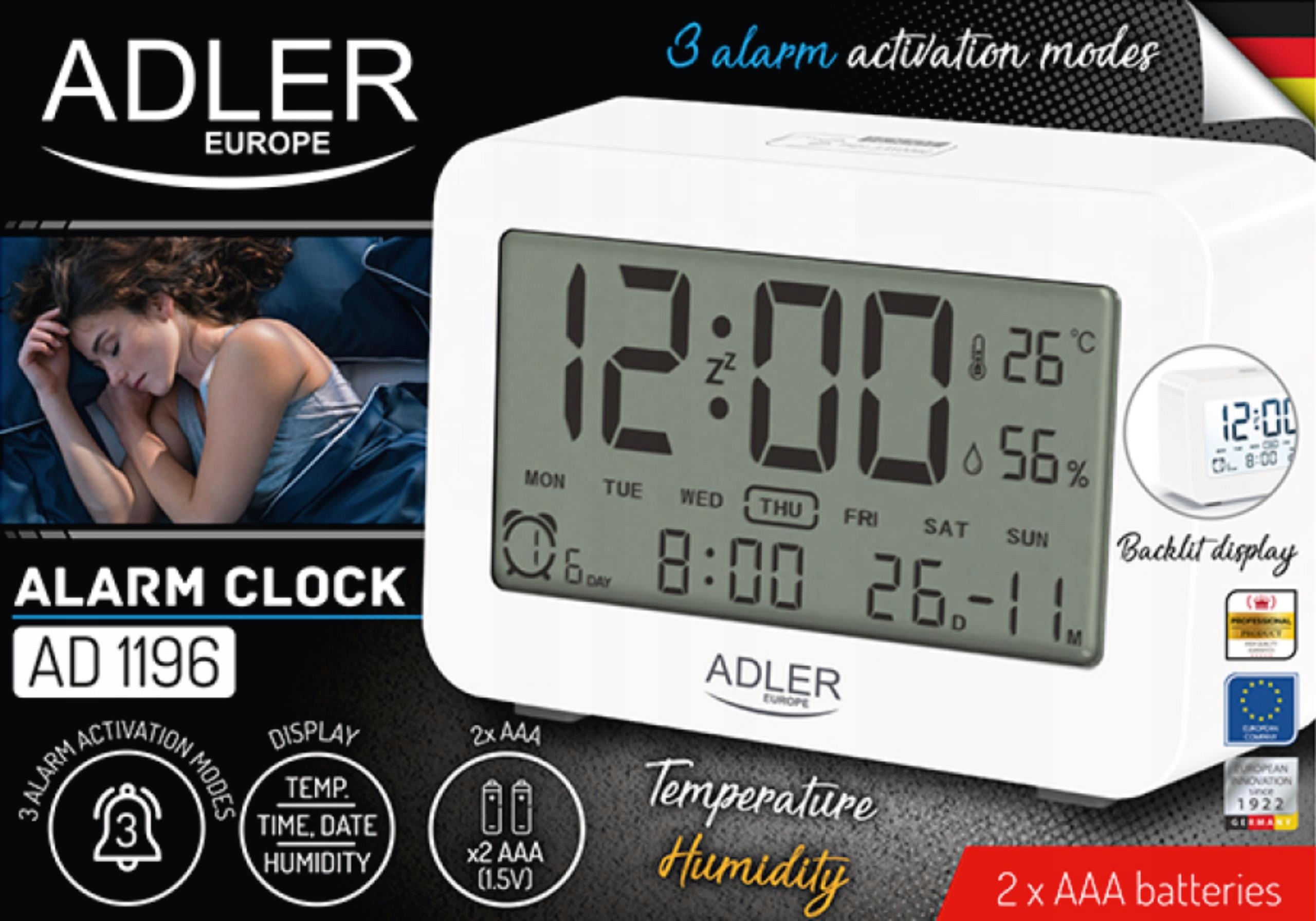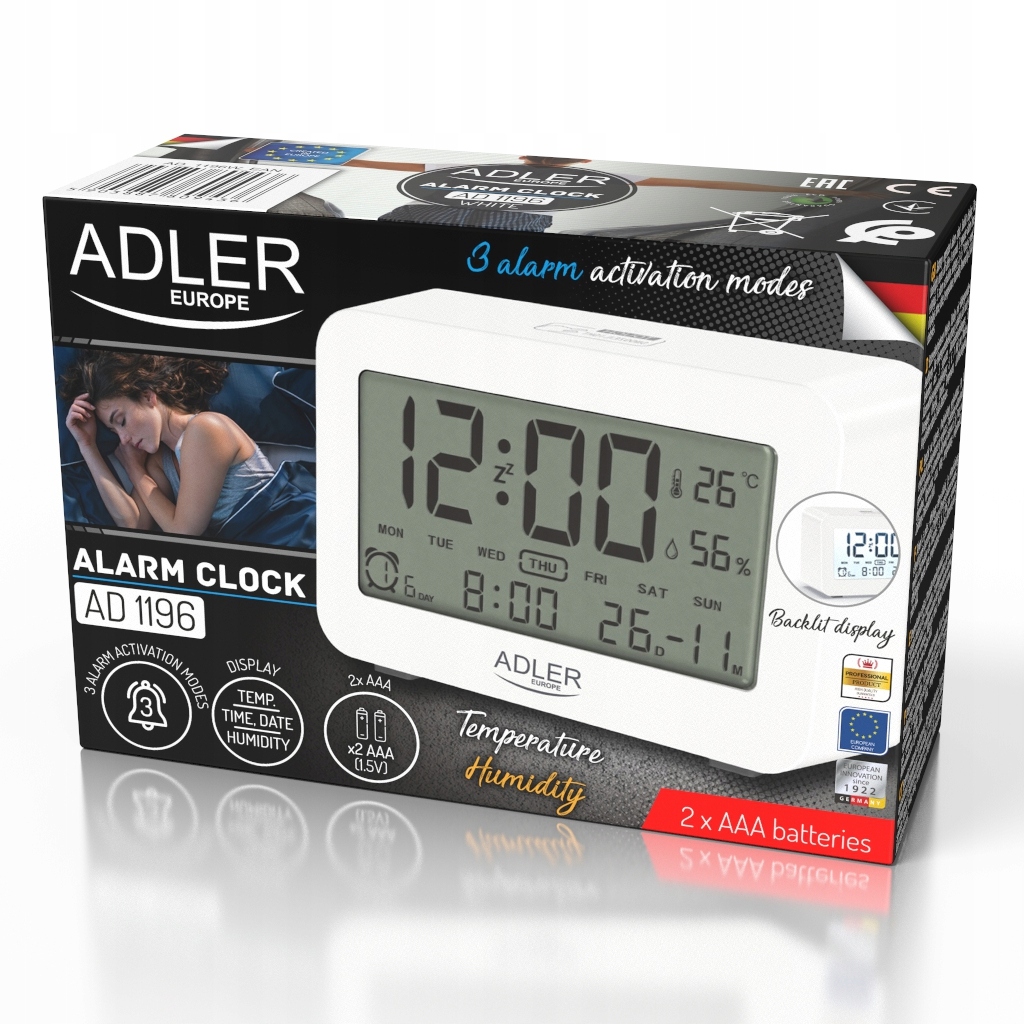 Godzina | Data | Alarm | Wilgotność i temperatura | Czytelny podświetlany wyświetlacz |