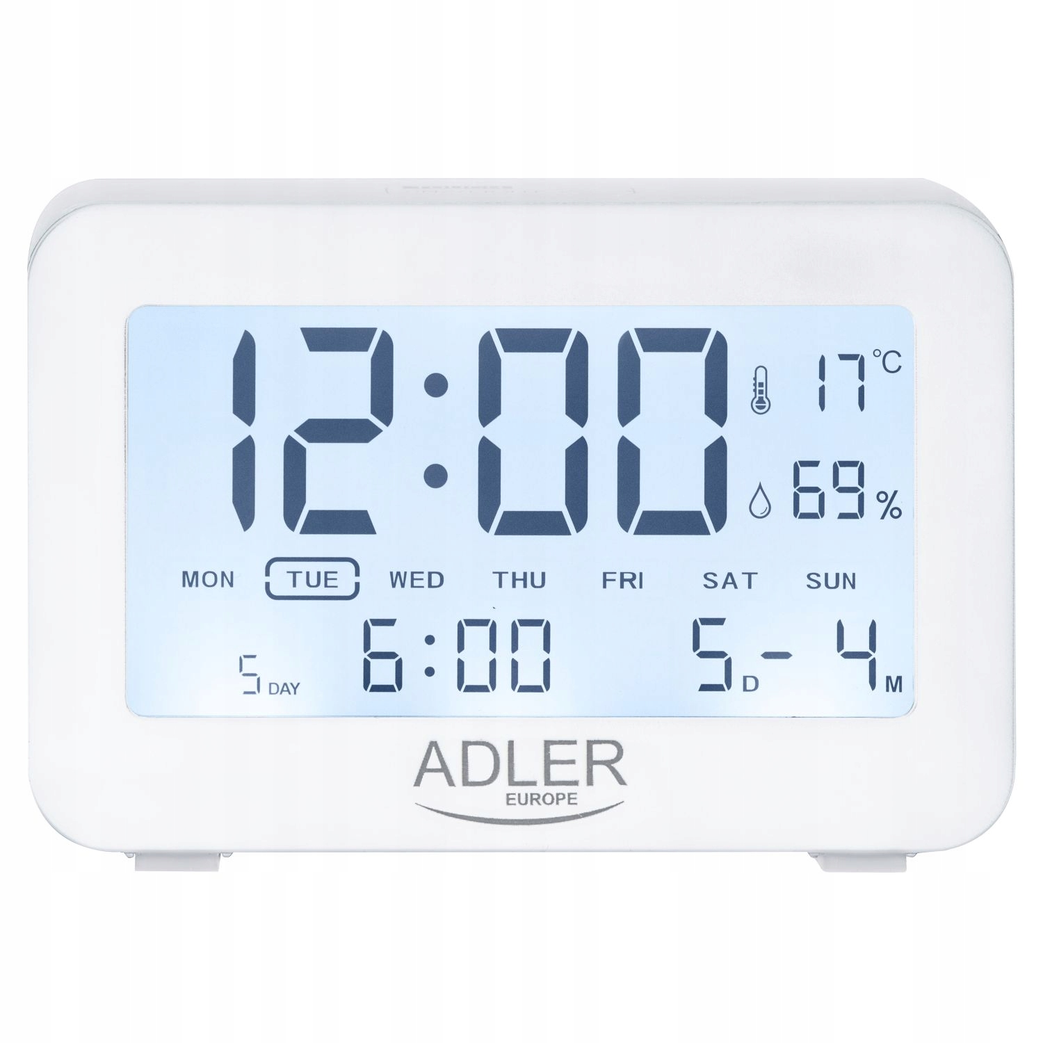 ➡️Biała obudowa, czarne cyfry i niebieskie podświetlenie.