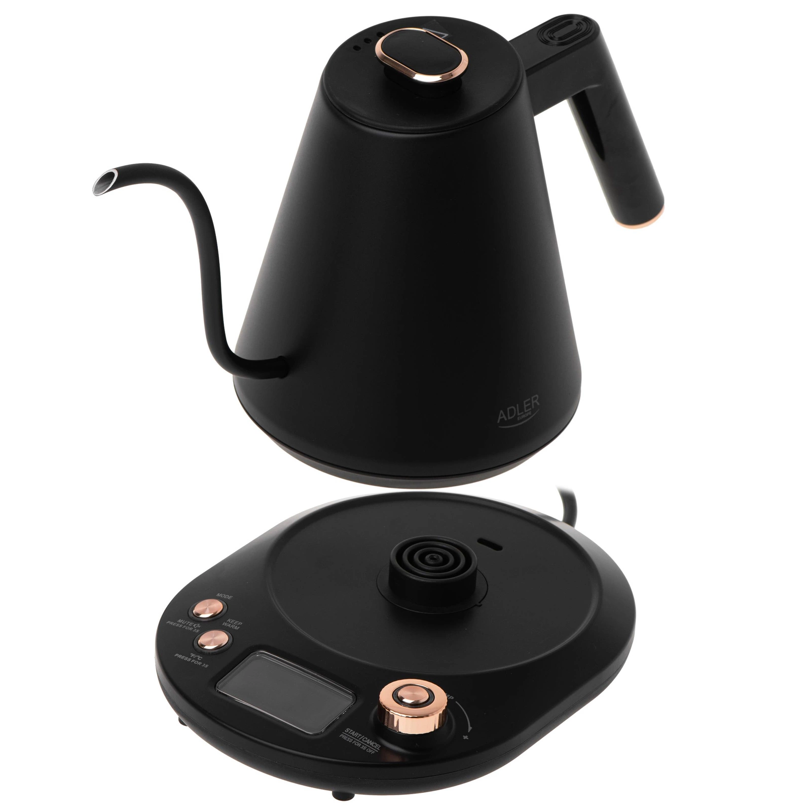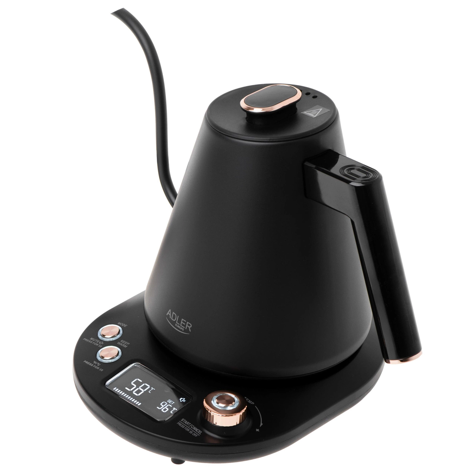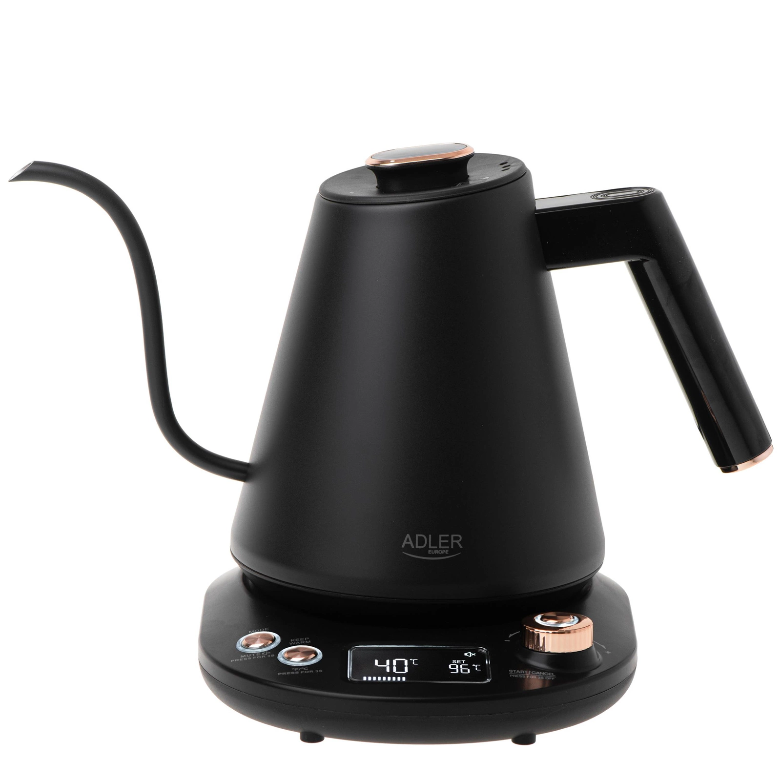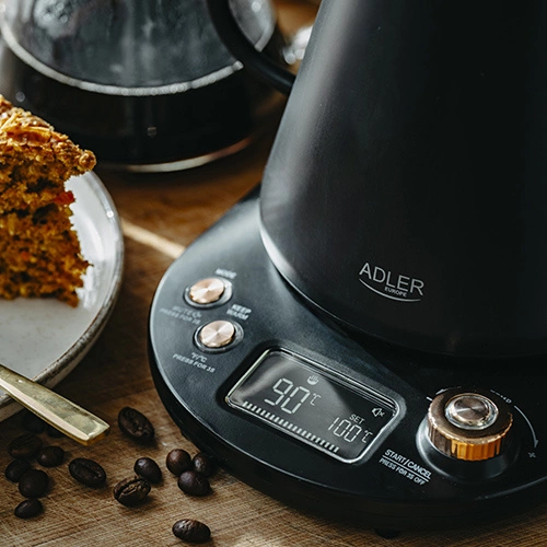 - Szerszym zakresem regulacji temperatury (40°C do 100°C, co 5°C) w porównaniu do standardowych czajników oferujących tylko kilka opcji temperatury.