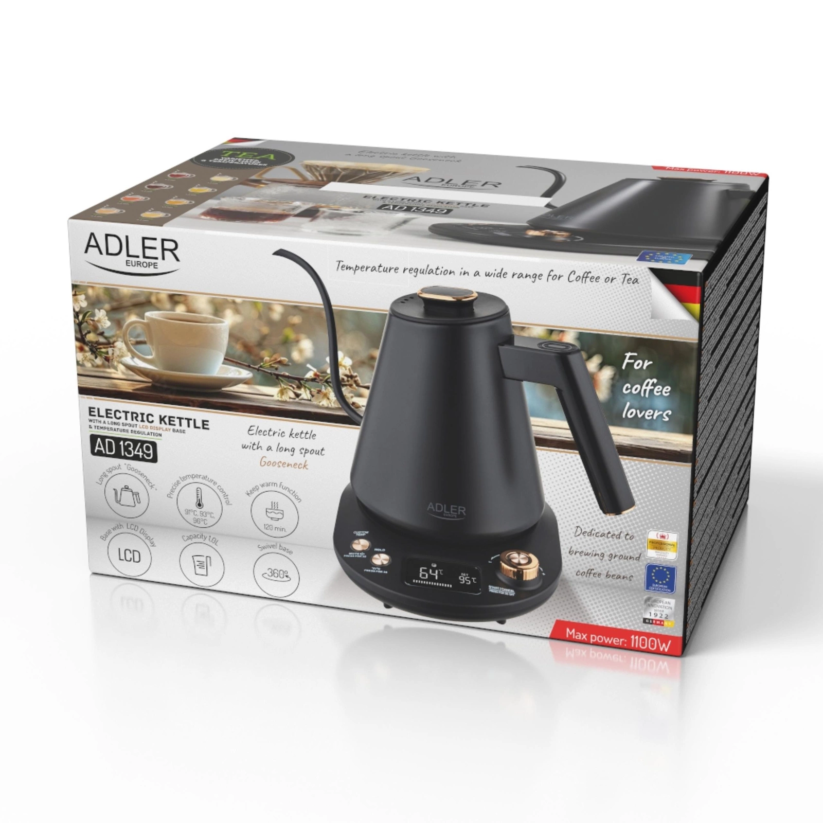 Czajnik elektryczny 1.0L, regulacja 40-100°C, podtrzymanie, LED Adler AD1349