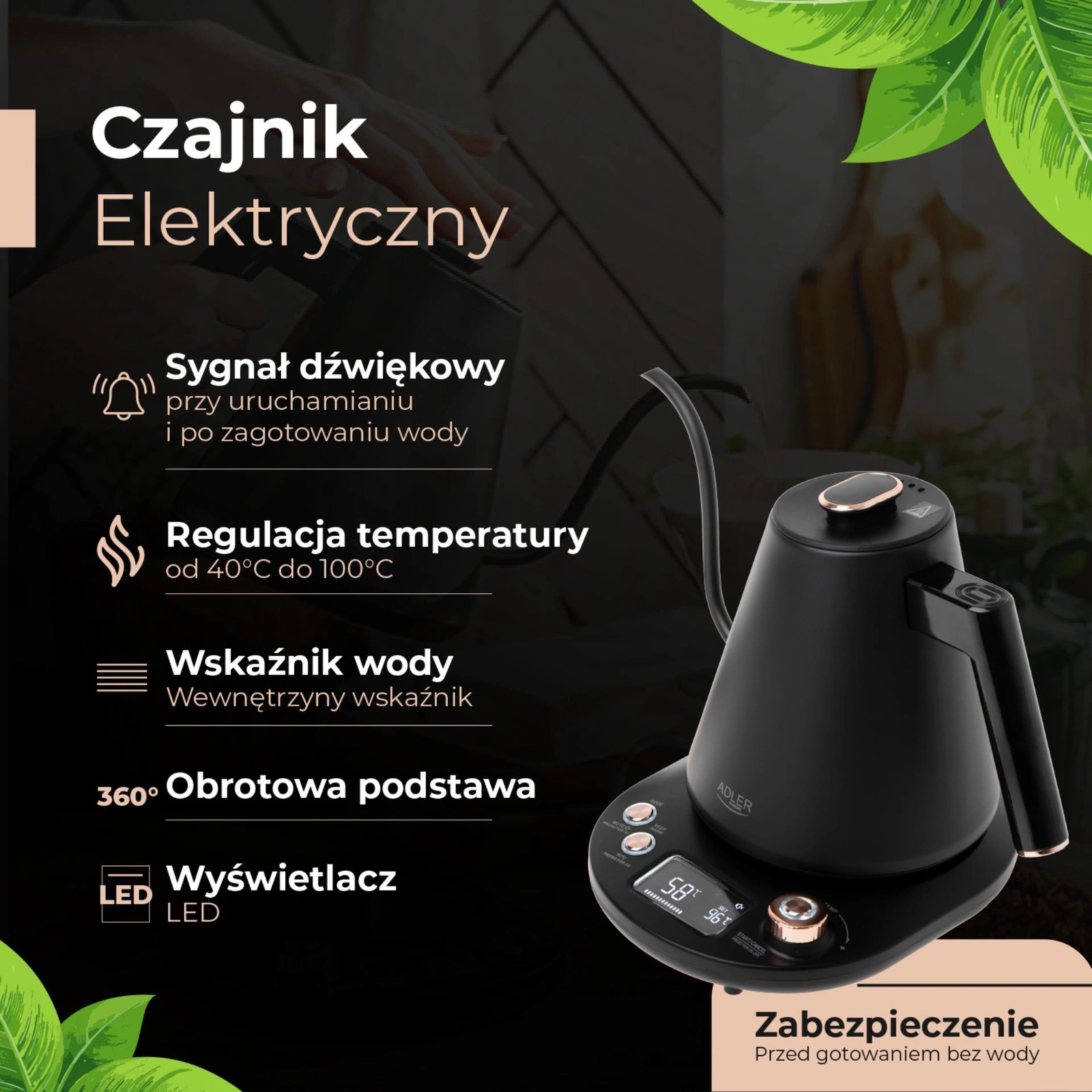 - Zabezpieczenie przed Gotowaniem bez Wody: Czajnik automatycznie się wyłączy, jeśli wykryje brak wody, co zapobiega uszkodzeniom i zwiększa bezpieczeństwo.