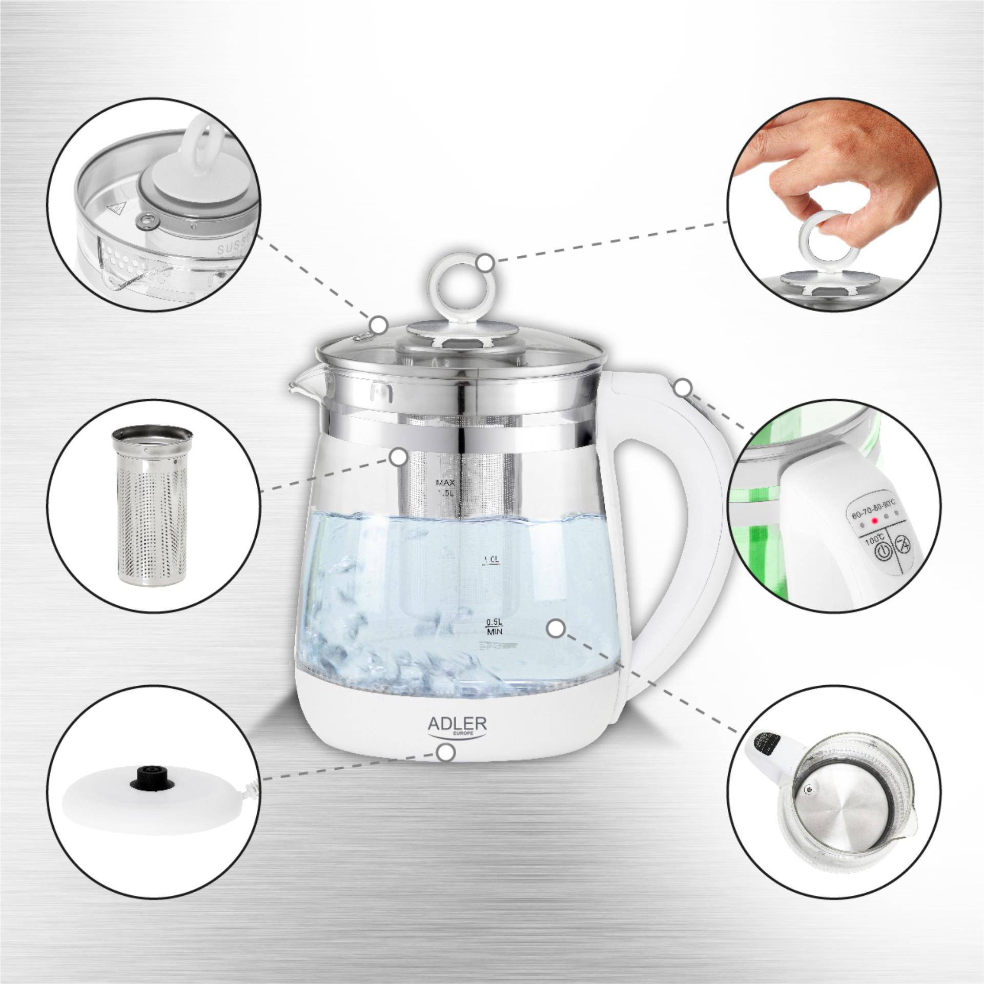 Czajnik elektryczny, szklany z podświetleniem LED i regulacją temperatury oraz zaparzaczem Adler
