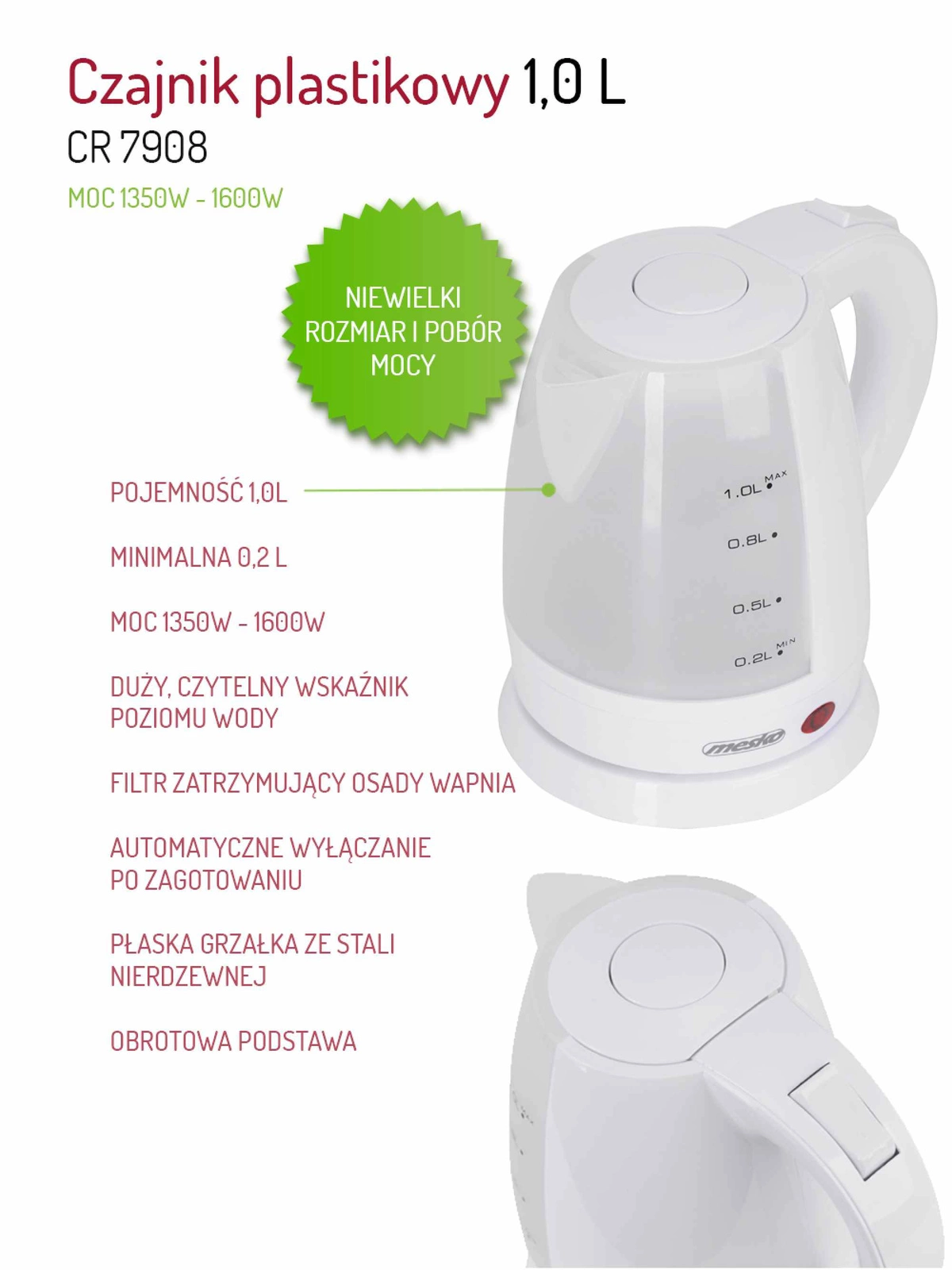 Zabezpieczenie przed gotowaniem bez wody | Filtr zatrzymujący osady wapnia | Dwustronny wskaźnik poziomu wody równie wygodny dla prawo- i leworęcznych użytkowników | Moc maksymalna 1600W