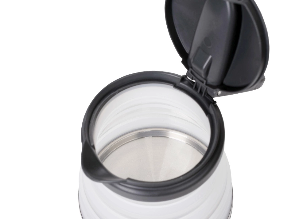 To, czego nie spodziewasz się, gdy myślisz o czajniku, to silikonowa, składana obudowa, która sprawia, że czajnik zajmuje bardzo mało miejsca. Po złożeniu możesz go przechowywać w szafce czy szufladzie, co zapewni cenne miejsce na blacie kuchennym, na przykład w niewielkiej przyczepie czy kamperze. Szeroko otwierająca się pokrywka umożliwia wygodne nalewanie wody i czyszczenie.