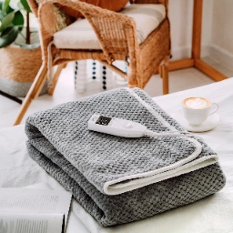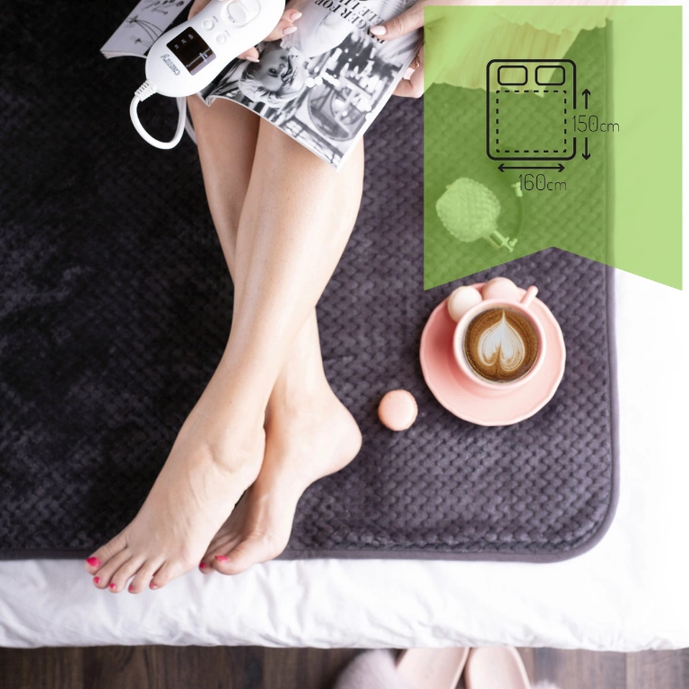 - Odłączany przewód zasilający z pilotem LCD: Umożliwia łatwą regulację temperatury i czasu, a odłączany kabel pozwala na pranie koca w pralce.