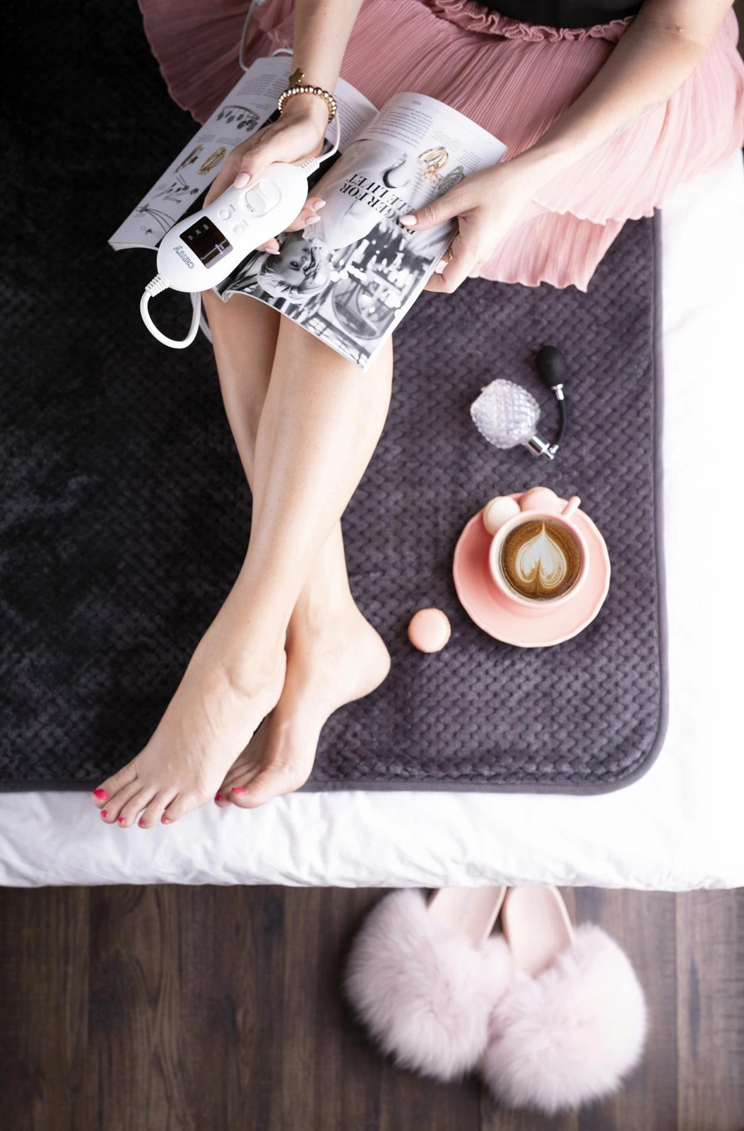 - Czasomierz: 1/2/10 godzin lub tryb pracy ciągłej „Always on”: Masz pełną kontrolę nad czasem działania koca, idealnie do zasypiania lub dłuższego relaksu.