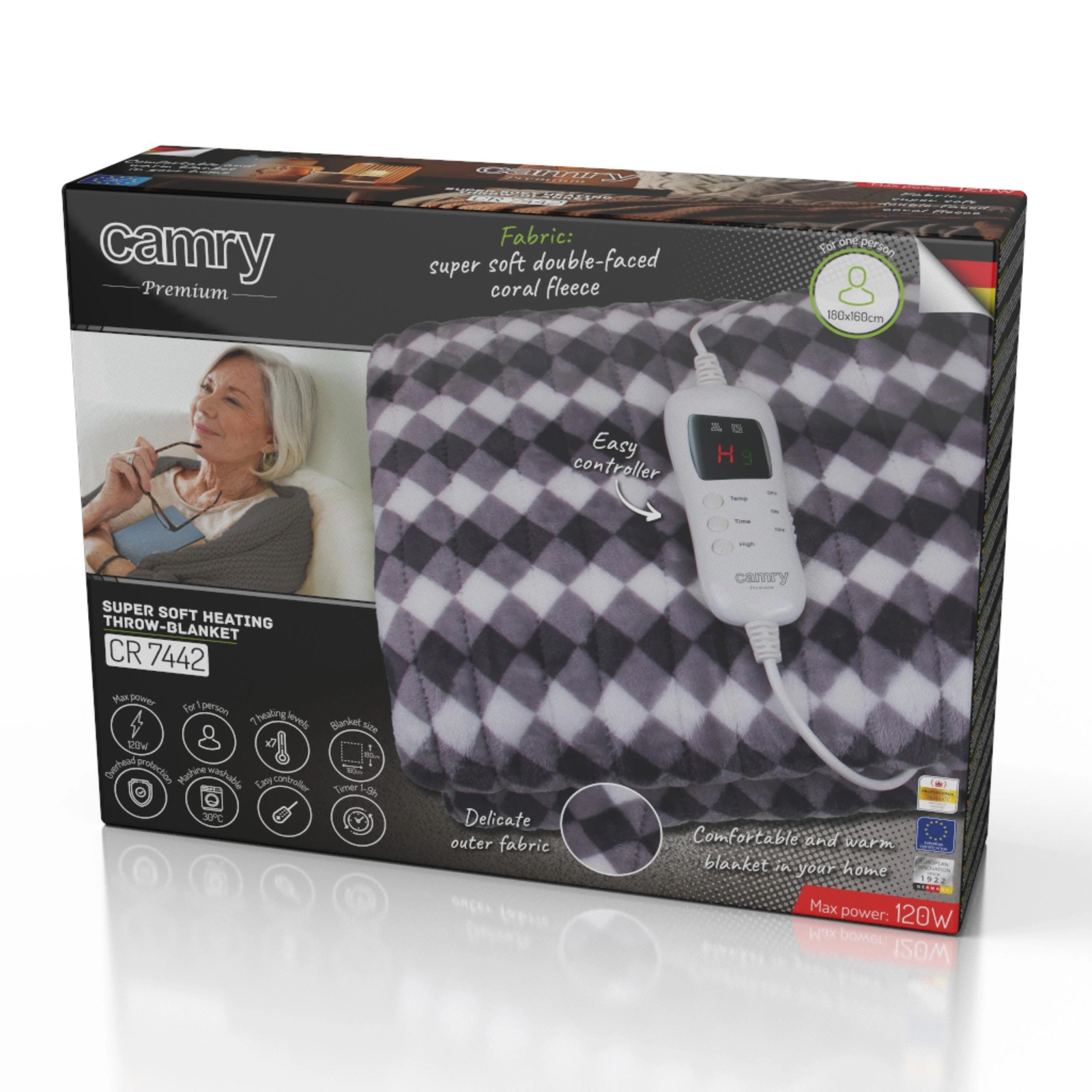 Elektryczny koc nakładany Camry CR 7442 zapewnia ciepło i komfort wypoczynku, umożliwiając otulenie ciała dzięki wyjątkowej miękkości tkaniny i ogromnemu rozmiarowi 160x180cm. Jest również wskazany dla osób dbających o zdrowie. Zapewnia szybkie i równomierne rozprowadzenie ciepła, co pozwala rozkoszować się ciepłem podczas siedzenia na fotelu. Koc wykonano z puszystego i miłego w dotyku materiału, który dodatkowo umili wieczorny relaks.