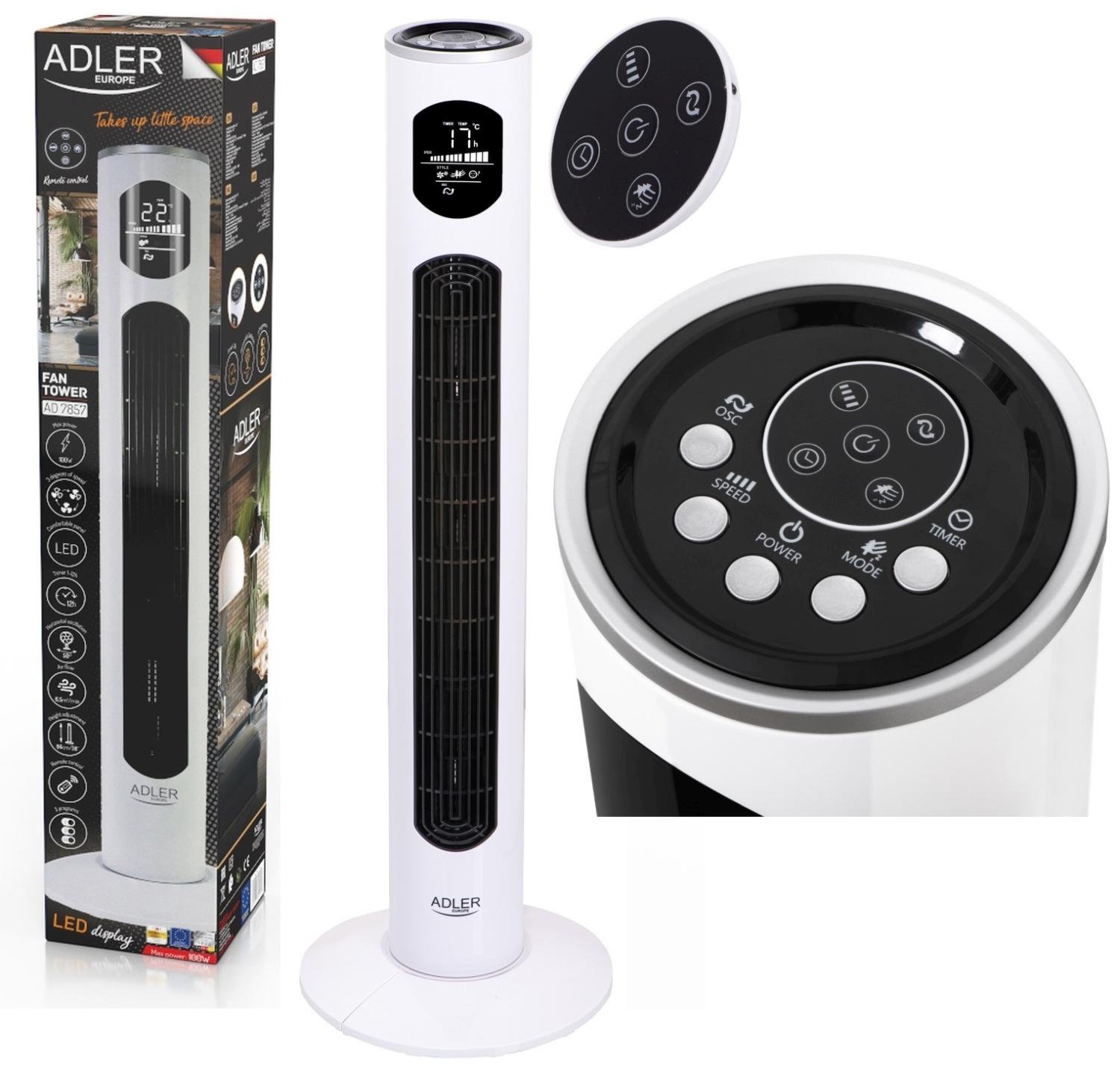 Wentylator kolumnowy AD 7857 to właściwy wybór dla osób oczekujących urządzenia, które skutecznie chłodzi nie zajmując dużej powierzchni pomieszczenia. Funkcja oscylacji umożliwia obrót poziomy kolumny rozsyłając powietrze w promieniu 50 stopni w lewą i prawą stronę lub ustawienie w pozycji nieruchomej. Trzy prędkości nawiewu, wyświetlacz LED, pilot zdalnego sterowania i timer to główne zalety produktu. Trzy prędkości nawiewu do wyboru. Zakres czasomierza 1-12 godzin. W kolumnie znajduje się wygodny uchwyt do przenoszenia. Pilot (1 szt. CR2025). Wysokość wentylatora kolumnowego to 96 cm.