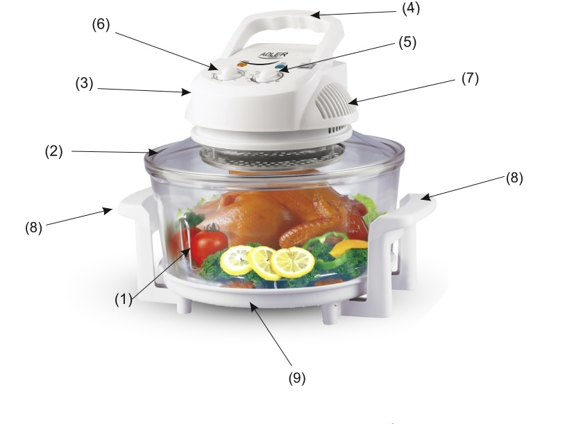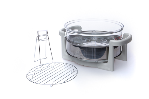 Moc maksymalna 1400W | Temperatura regulowana: 90 - 250°C | Pojemność szklanej misy 12L | Pierścień zwiększający pojemność aż do 18L | Funkcja termoobiegu | Funkcja rozmrażania