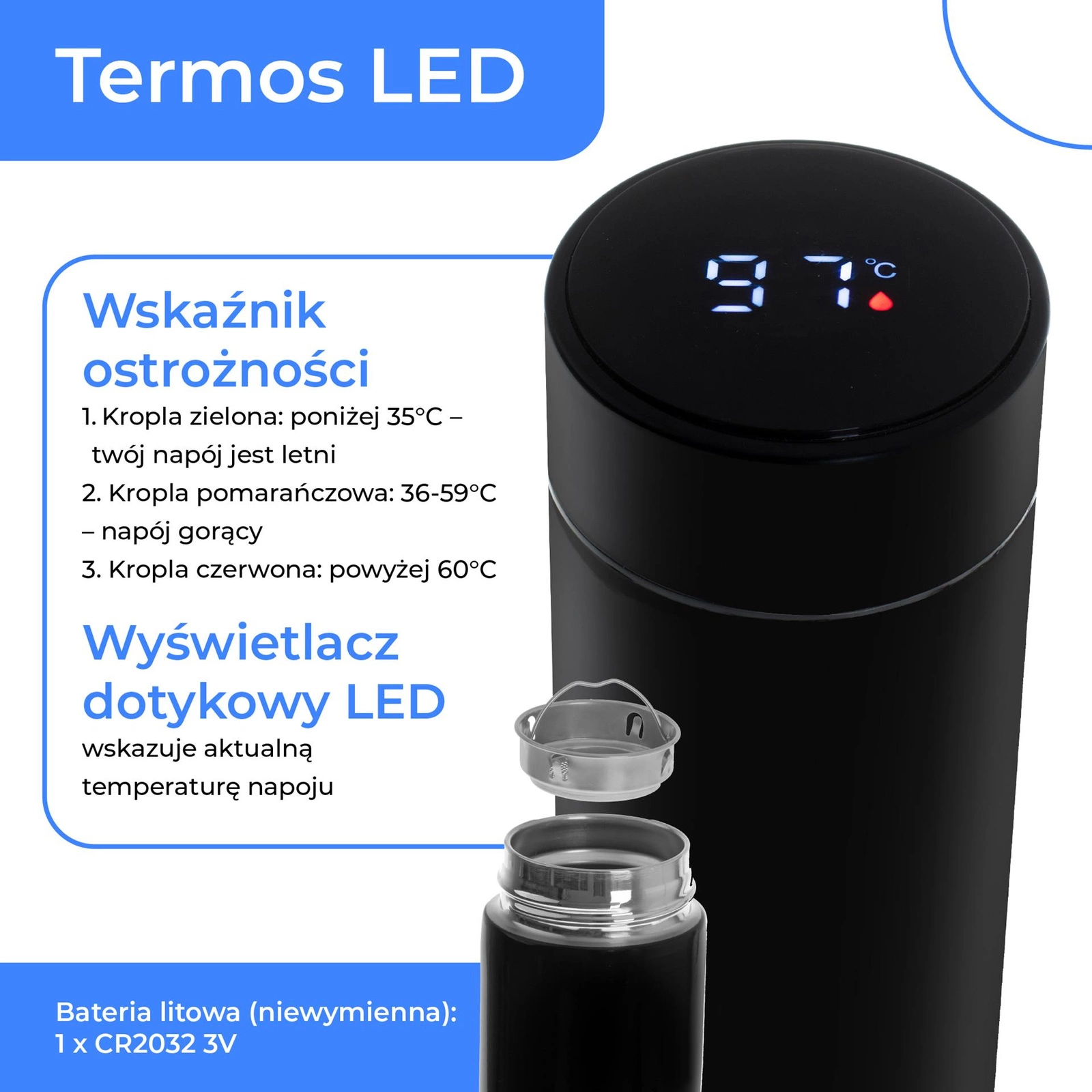- Wyświetlacz dotykowy LED: Wskazuje aktualną temperaturę napoju w czasie rzeczywistym.