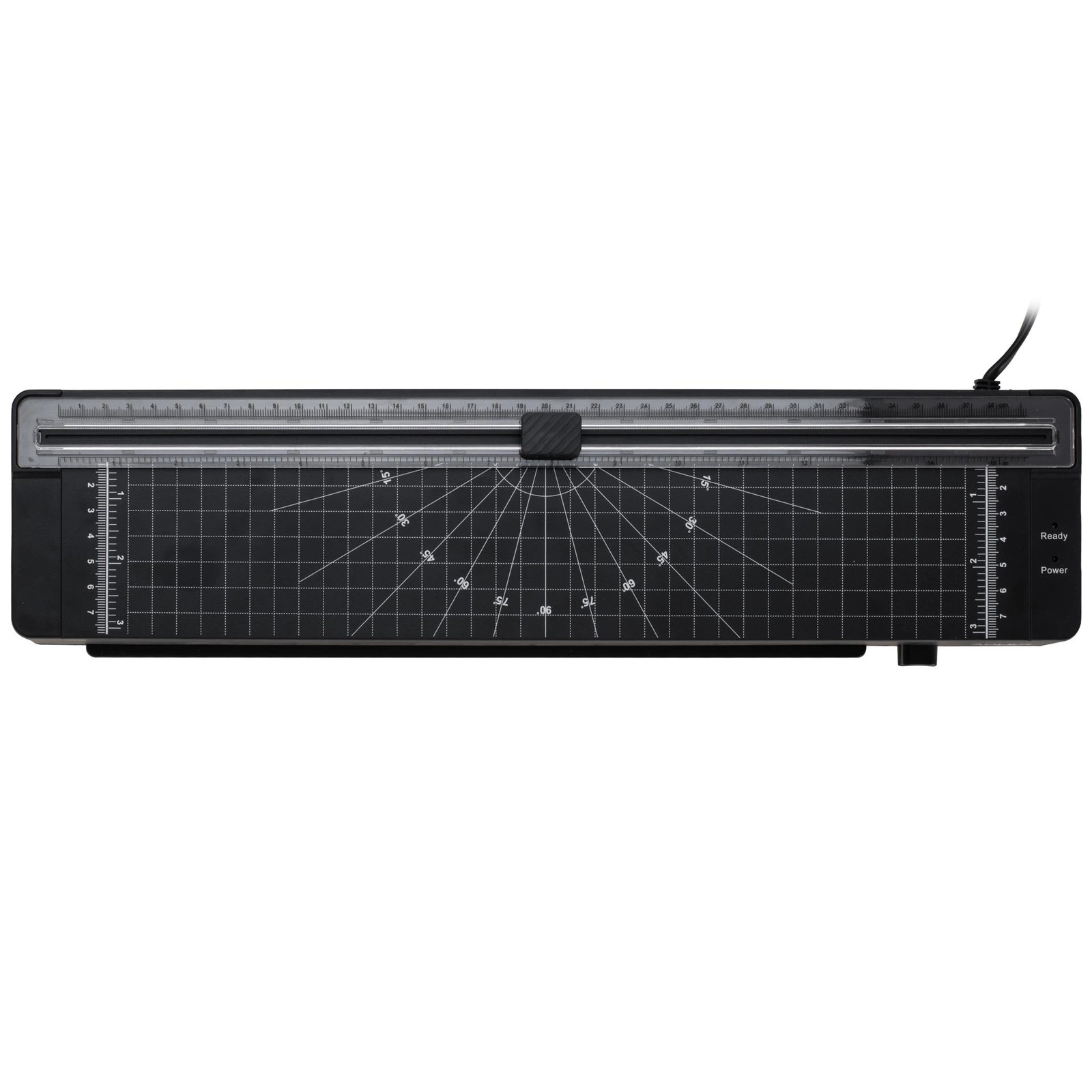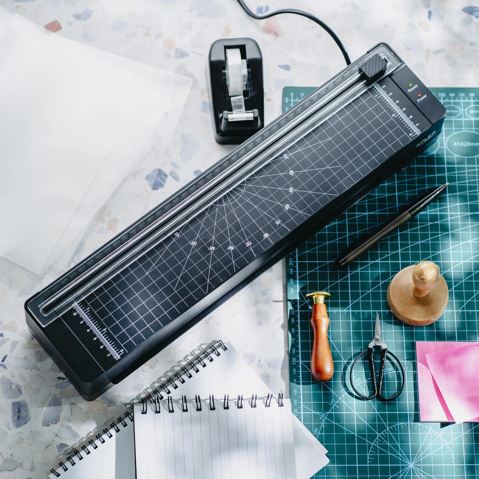 - Trymer do Precyzyjnego Cięcia Folii: Wbudowany trymer pozwala na idealne i precyzyjne docięcie folii po laminowaniu, co zapewnia estetyczny wygląd dokumentów.