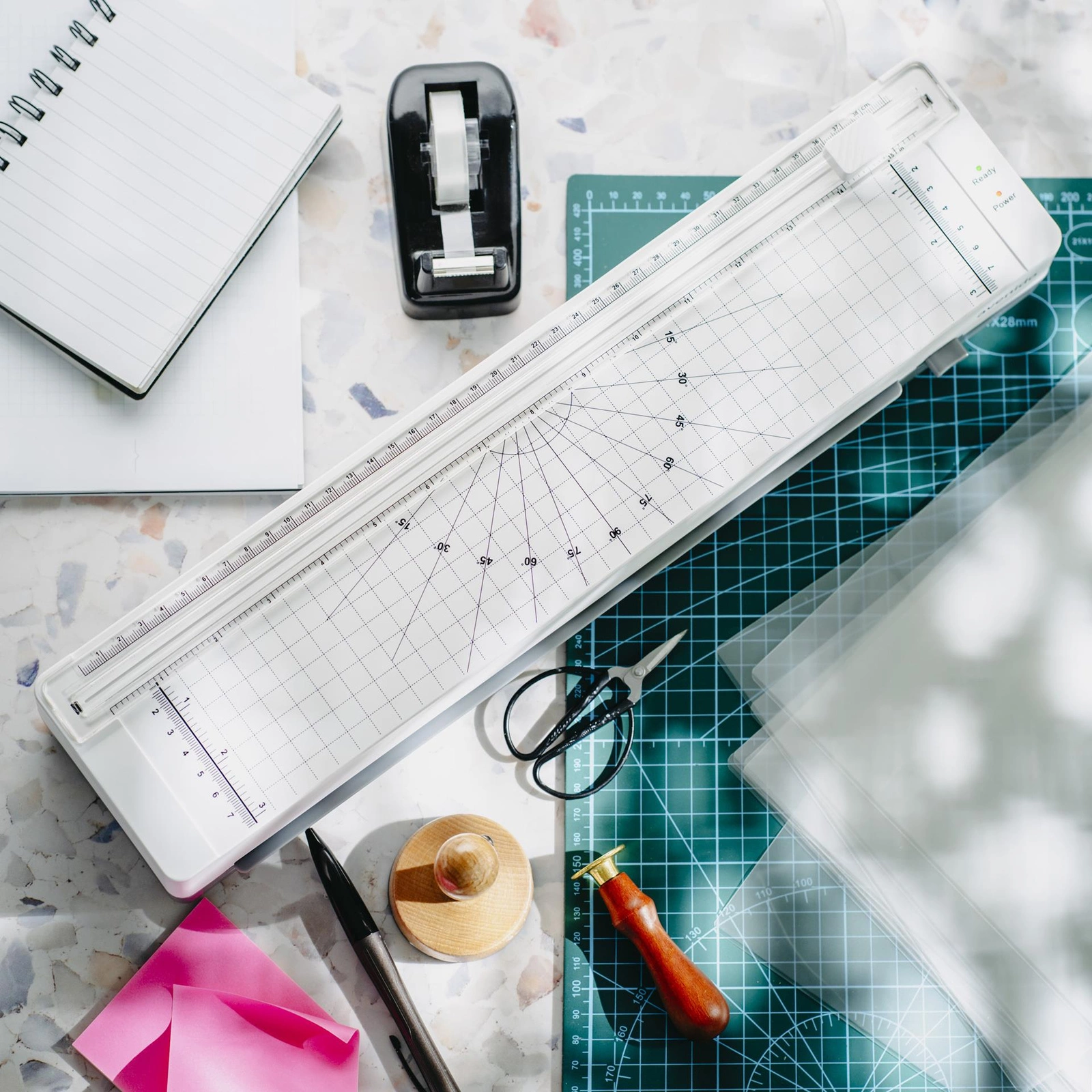 - TRYMER NA OBUDOWIE: Ułatwia cięcie zalaminowanych dokumentów, zapewniając estetyczne krawędzie bez użycia nożyczek.