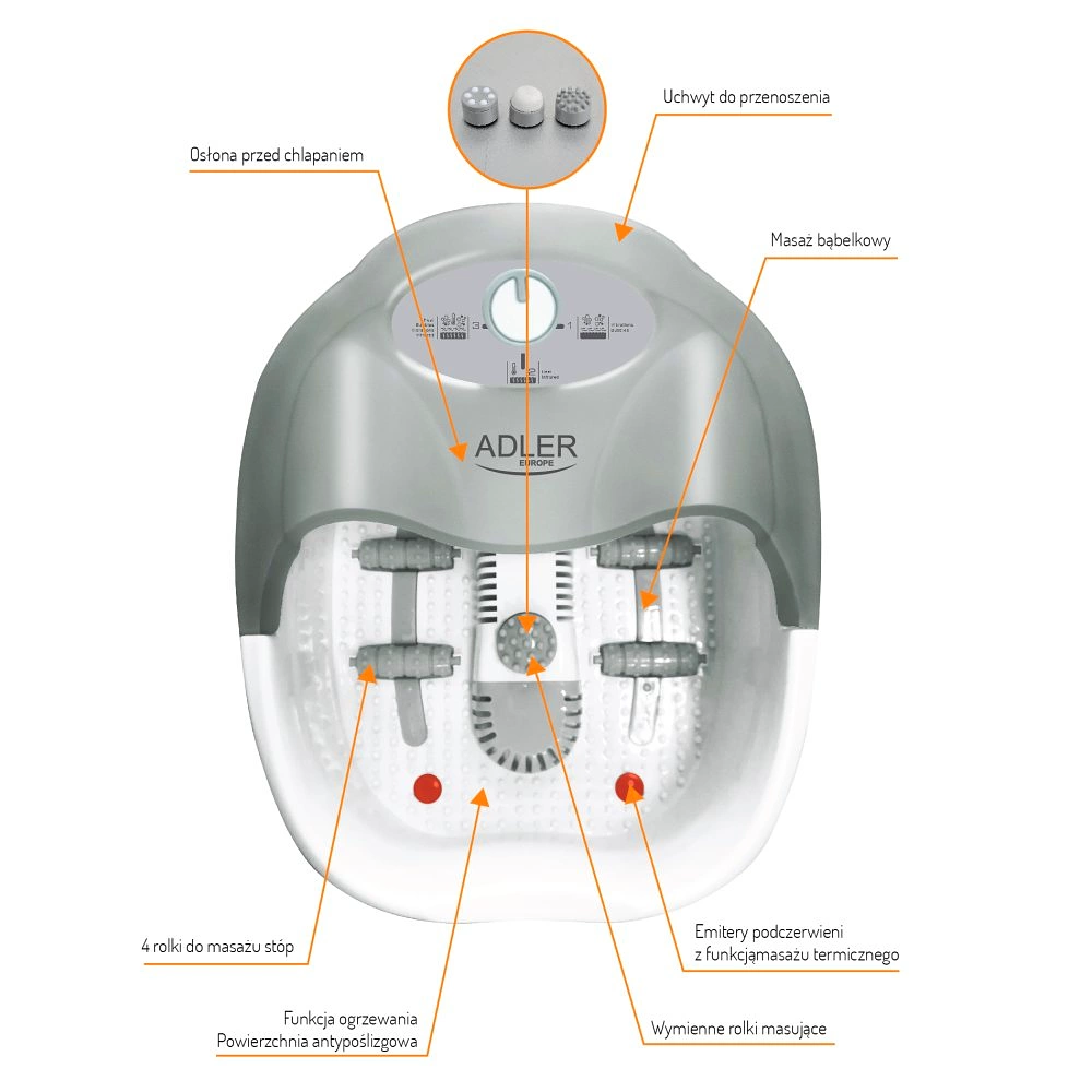 Masażer do stóp z funkcją podgrzewania, podczerwieni, 4 rolki, 3 nasadki Adler AD 2167