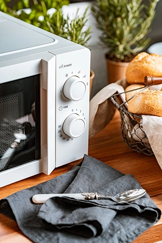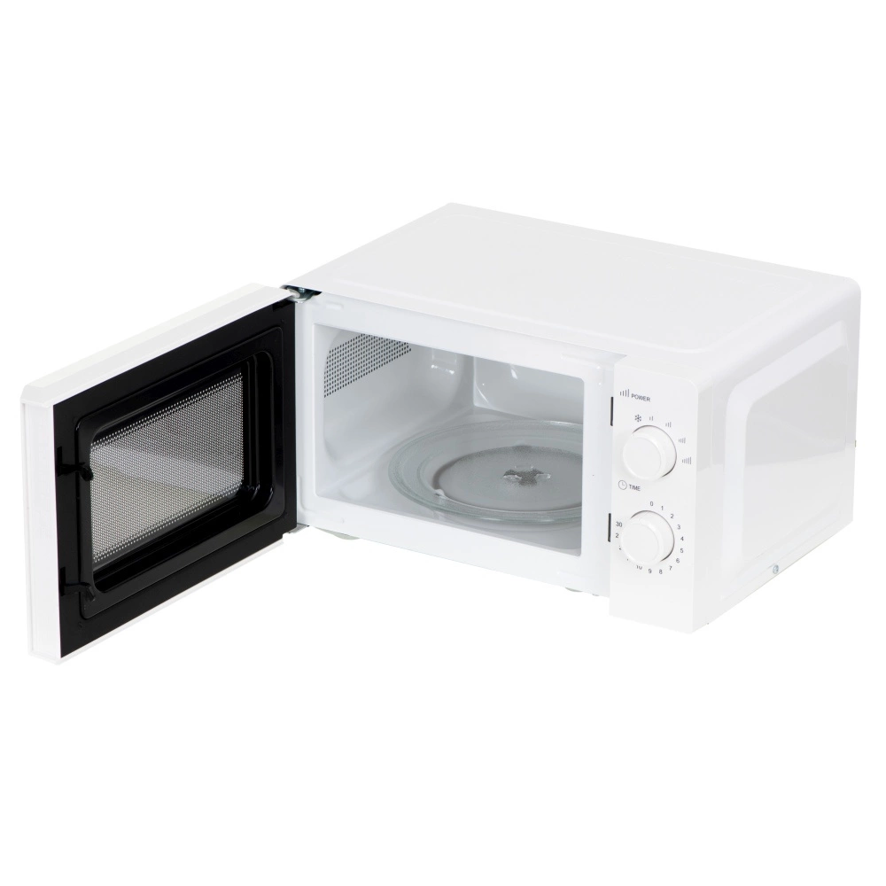 Uniwersalna kuchenka mikrofalowa o pojemności 20 l. Estetyczna, prosta w obsłudze i gotowa do użycia w każdej kuchni. Dzięki 5 poziomom fal i funkcji rozmrażania pozwala przygotować smaczne dania lub podgrzać gotowe produkty. Obrotowy talerz gwarantuje równomierne podgrzewanie, a programator czasowy chroni posiłek przed przypaleniem. Kuchenka charakteryzuje się wymiarami wewnętrznymi 315 x 296 x 211 mm dzięki czemu można w niej umieścić talerz z pizzą.