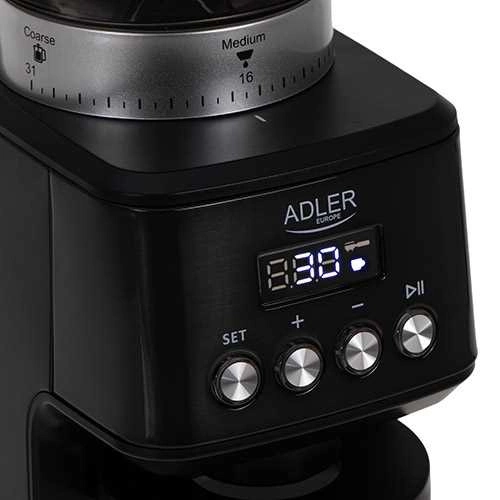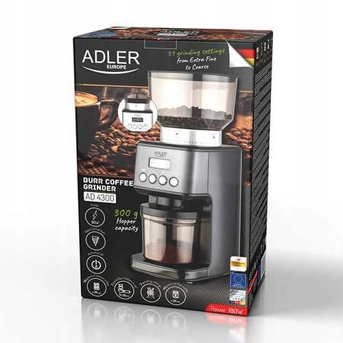 Młynek do kawy żarnowy, 31 ustawień mielenia, timer, 300g zbiornik – Adler AD 4300