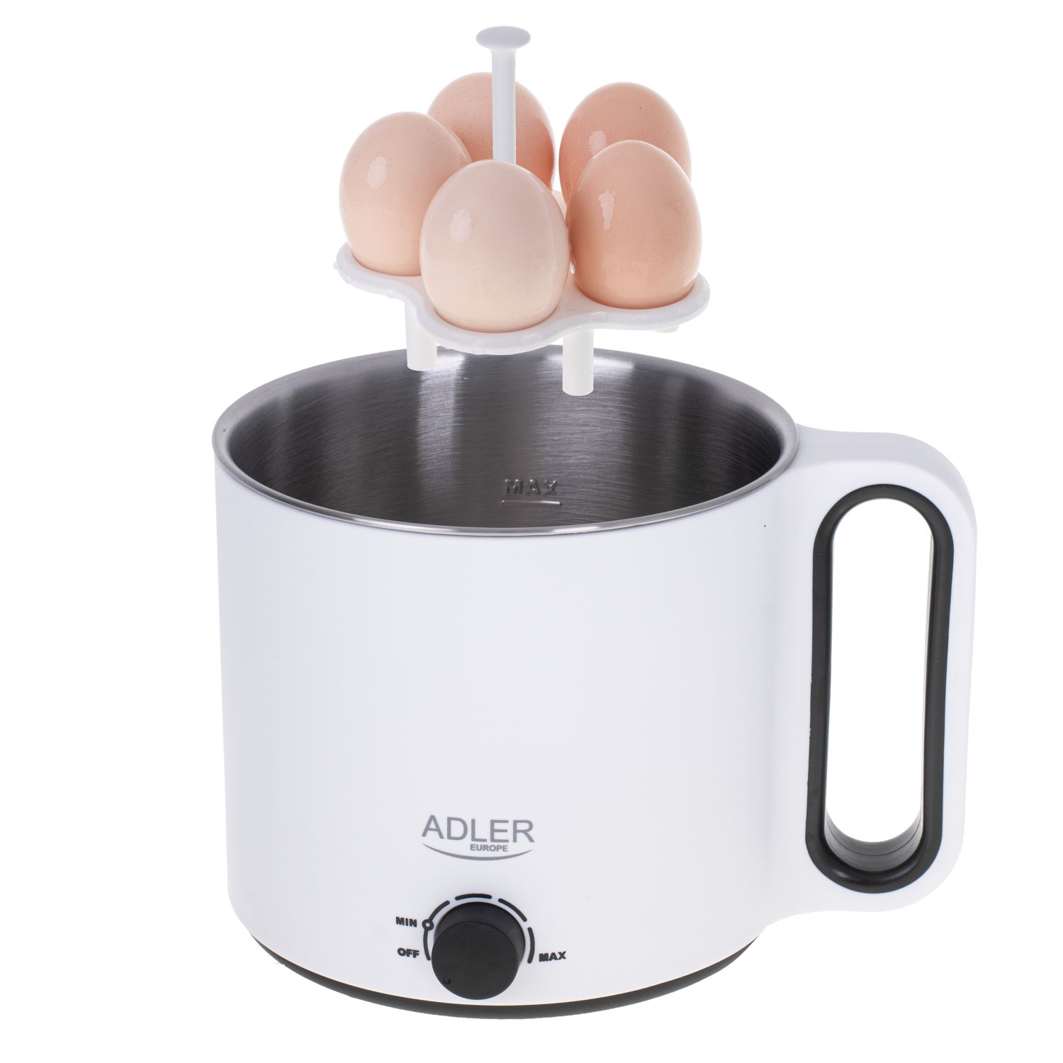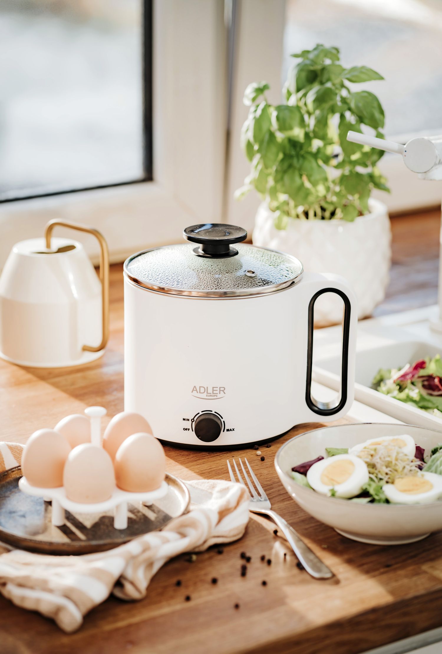Wybierając nasz garnek elektryczny, będziesz mieć większą kontrolę nad procesem gotowania i bez problemu przygotujesz tzw. jednogarnkowe potrawy. Garnek ma pięć podstawowych funkcji ułatwiających obróbkę różnych produktów. Dzięki zastosowanej technologii możesz ugotować w nim wodę do herbaty, kawy czy innych gorących napojów. Śmiało zastąpi więc czajnik w małej kuchni czy na wyjeździe. Poza tym ugotujesz w nim zupę, makaron, ryż i kiełbaski w dowolnej ilości. Do zestawu dołączono też stojak umożliwiający ugotowanie pięciu jajek oraz sitko do parowania warzyw.