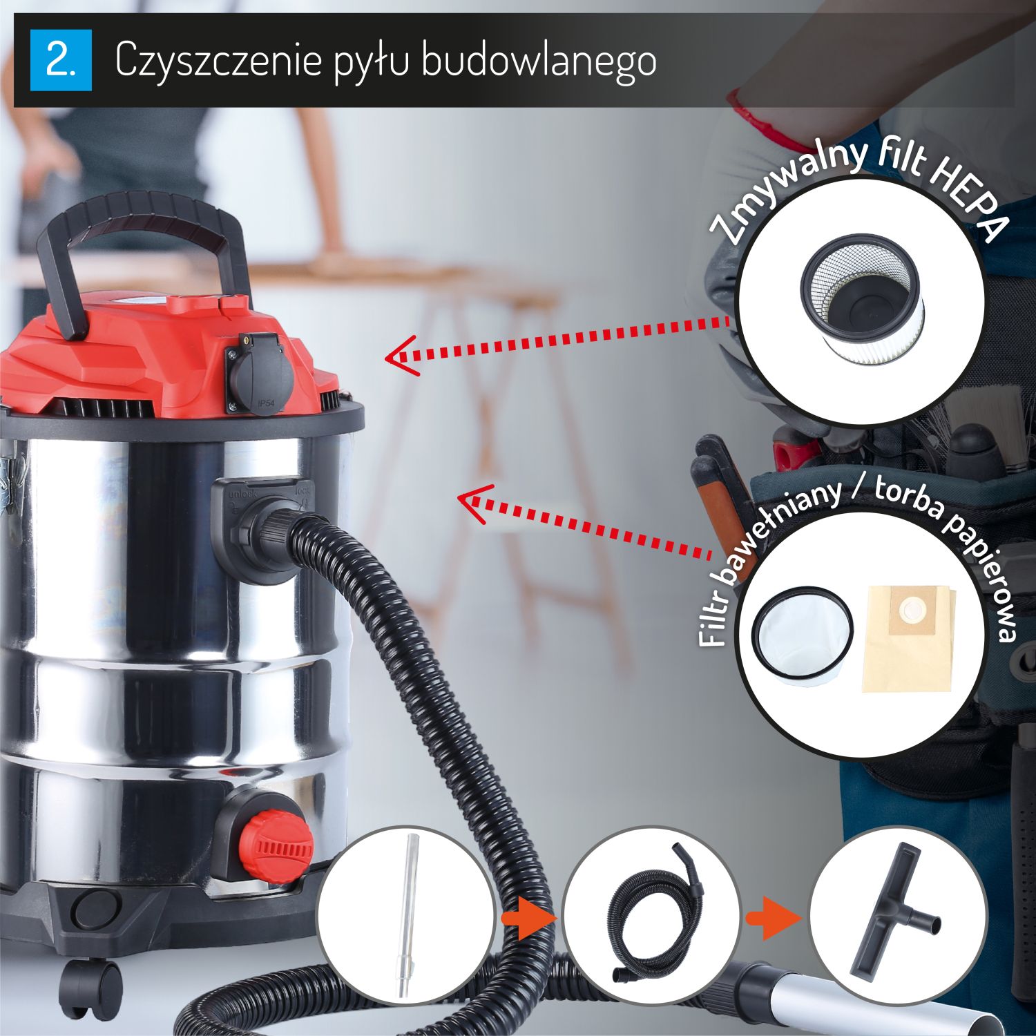 ✨Jest to zmywalny filtr HEPA do pracy na sucho, który docenią przede wszystkim alergicy, ognioodporny filtr bawełniany, papierowy worek o pojemności 25 litrów oraz zmywalny filtr gąbkowy.