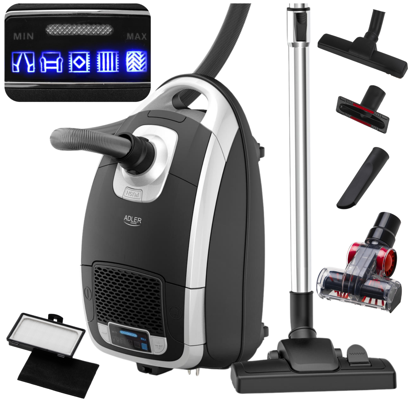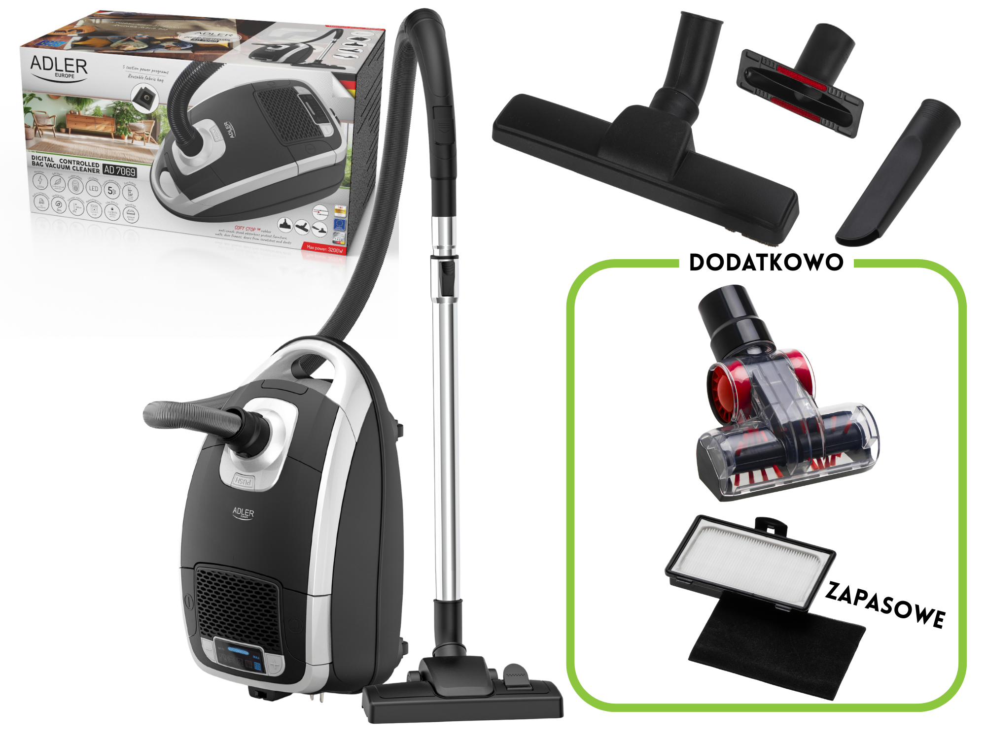 Odkurzacz workowy mocny, 3200W, 18 kPa, 5 programów mocy Adler AD 7069 + AD7069.2 + AD7069.3