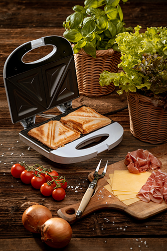 Praktyczny opiekacz do kanapek o mocy 750 W. Pozwala na jednoczesne przygotowanie 2 kanapek, które zostaną podzielone na 4 trójkątne kawałki. Specjalna powłoka na płytach grzewczych zapobiega przywieraniu, dzięki czemu urządzenie jest łatwe w utrzymaniu w czystości. Termostat sygnalizuje wystarczające nagrzanie płyt i zapewnia odpowiednią temperaturę przez cały proces opiekania. Dzięki temu przygotowane sandwiche są chrupiące i złociste. Dla wygody, opiekacz można przechowywać w pozycji pionowej.