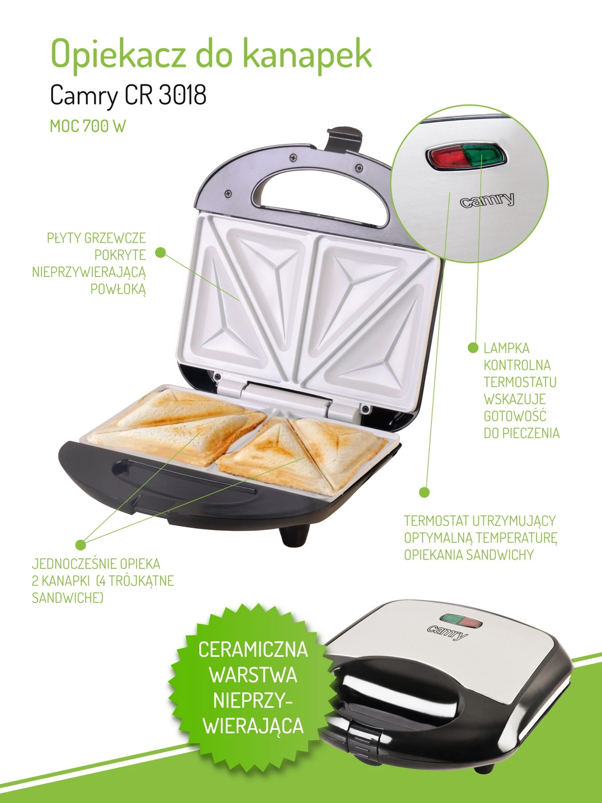 Szukasz sposobu na szybkie i chrupiące śniadanie, przekąskę czy kolację? Opiekacz do kanapek **Camry CR 3018** to idealne rozwiązanie, które pozwoli Ci urozmaicić swoje posiłki w kilka chwil!