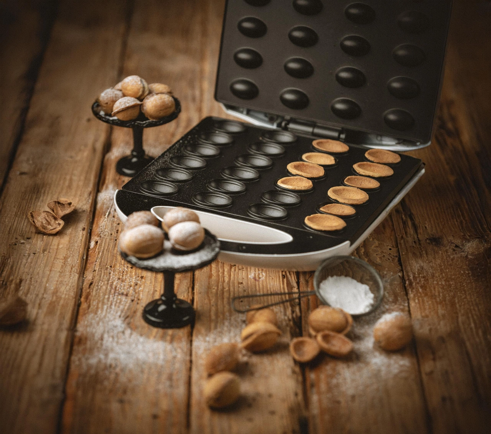 - Powłoka Nieprzywierająca NON-STICK – Bez Stresu i Łatwe Czyszczenie: Ciasto nie przyklei się do płyt! Specjalna powłoka nieprzywierająca gwarantuje, że orzeszki z łatwością odchodzą, a samo czyszczenie zajmie Ci zaledwie chwilę.