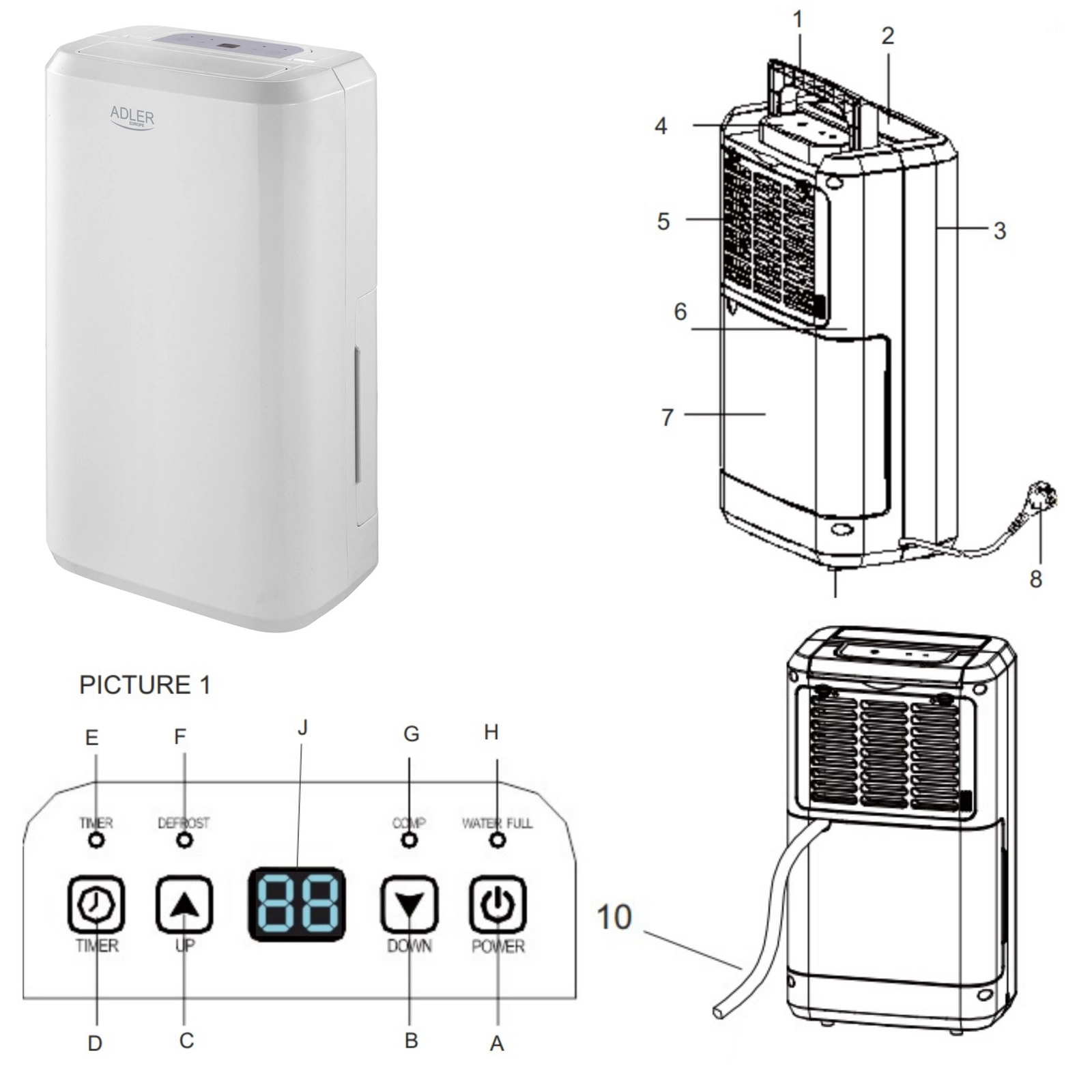 Osuszacz Powietrza 10L/24h z LCD Wyświetlaczem, Kompresorowy, Adler AD 7861