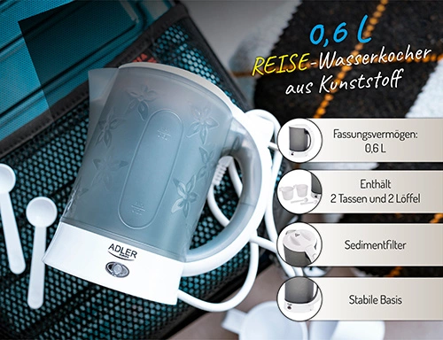 Podróżny Czajnik Plastikowy 0,6L Kompaktowy - Adler AD 1268