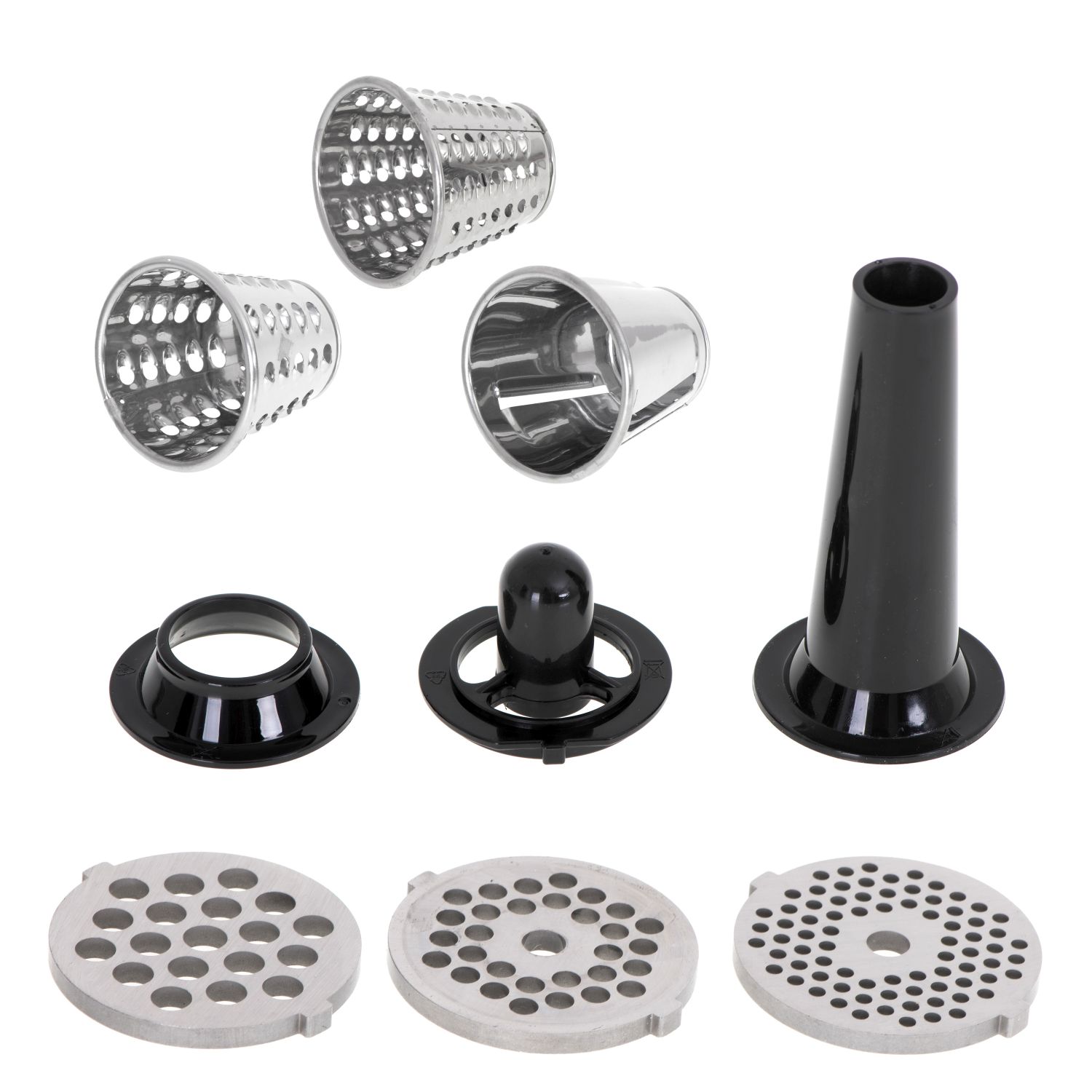 ✅Maszynka do mięsa wyposażona w 3 wymienne sitka ze stali nierdzewnej o średnicy otworów: 3mm, 5mm, 7mm oraz szatkownicę do warzyw z trzema ostrzami. Całość wykona jest z trwałych materiałów, łatwych do rozmontowania i czyszczenia.