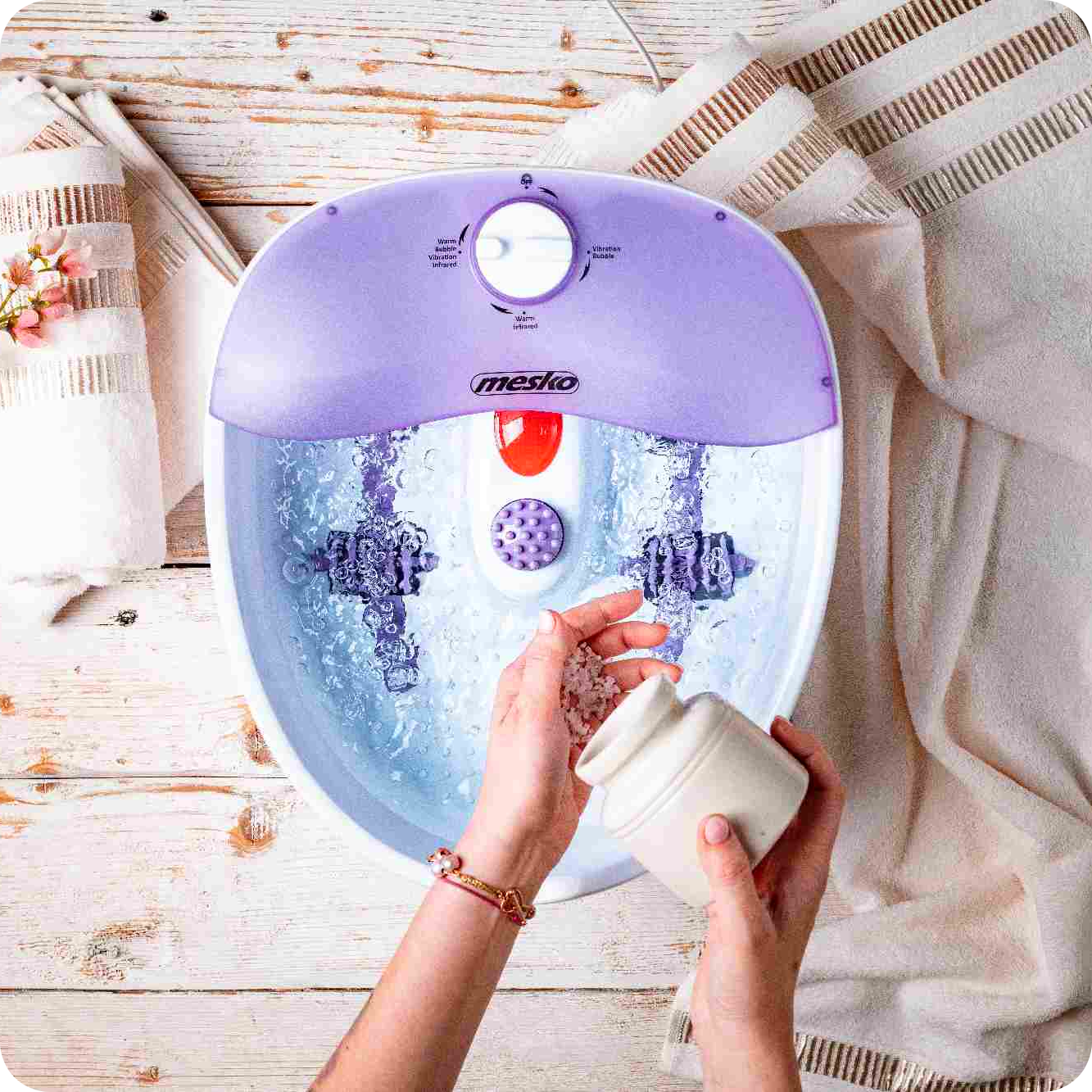 Kąpiel stóp w cieple działa kojąco i regenerująco, przynosząc ulgę zmęczonym stopom.