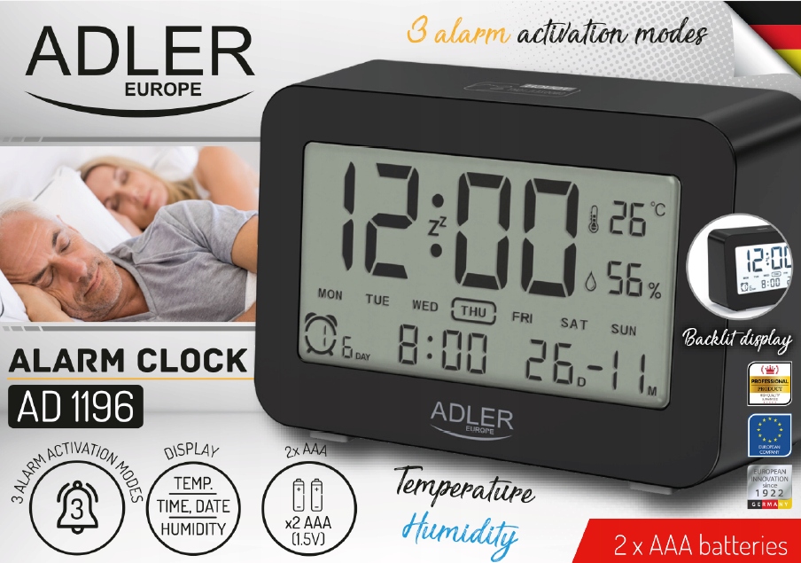 Godzina | Data | Alarm | Wilgotność i temperatura | Czytelny podświetlany wyświetlacz |