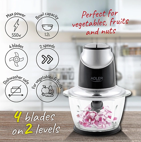 Rozdrabniacz kuchenny, szklana misa 1,2L, 4 ostrza, 550W – Adler AD 4082