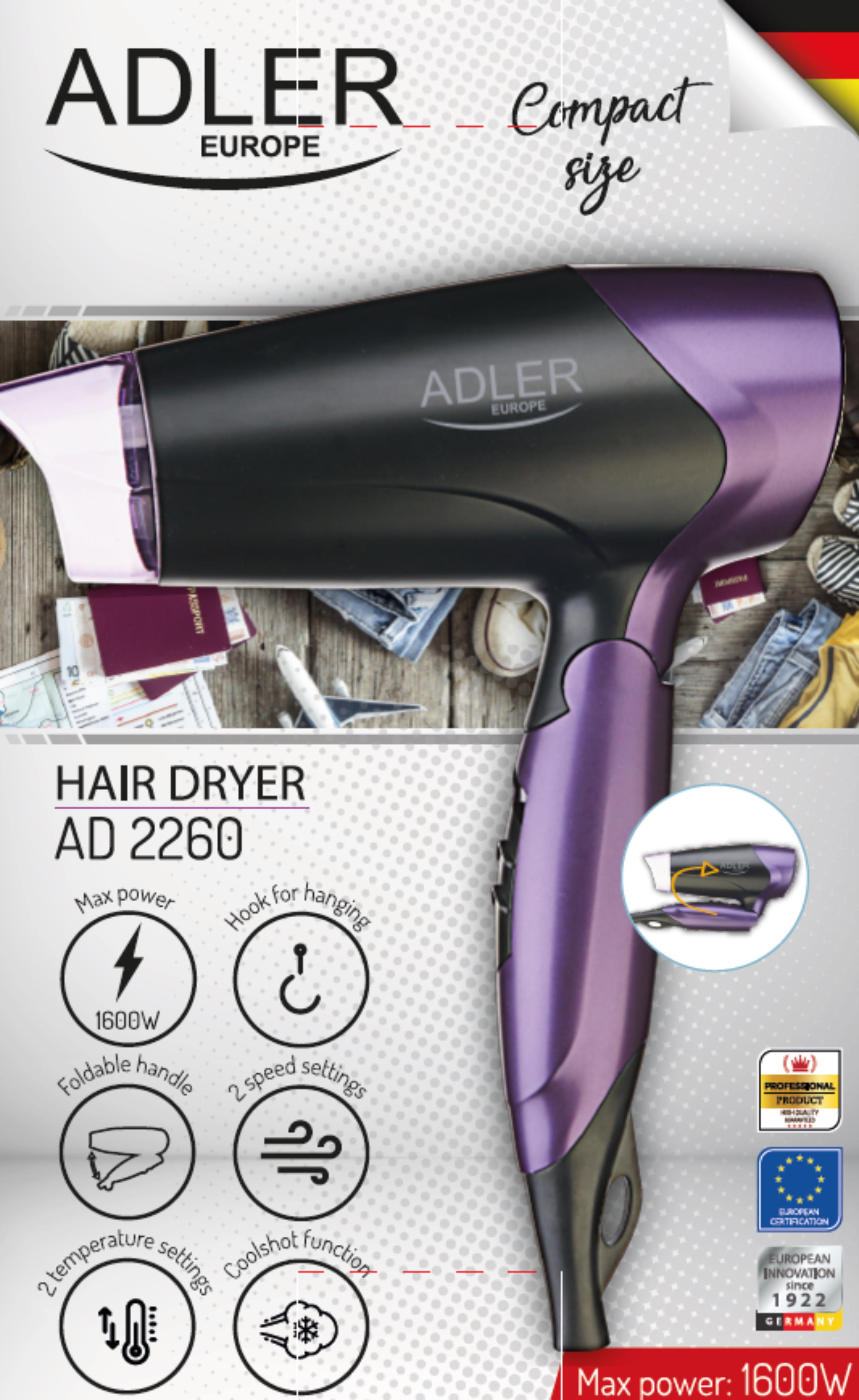 Suszarka do Włosów 1600W Kompaktowa, Lekka, Energooszczędna Adler AD 2260