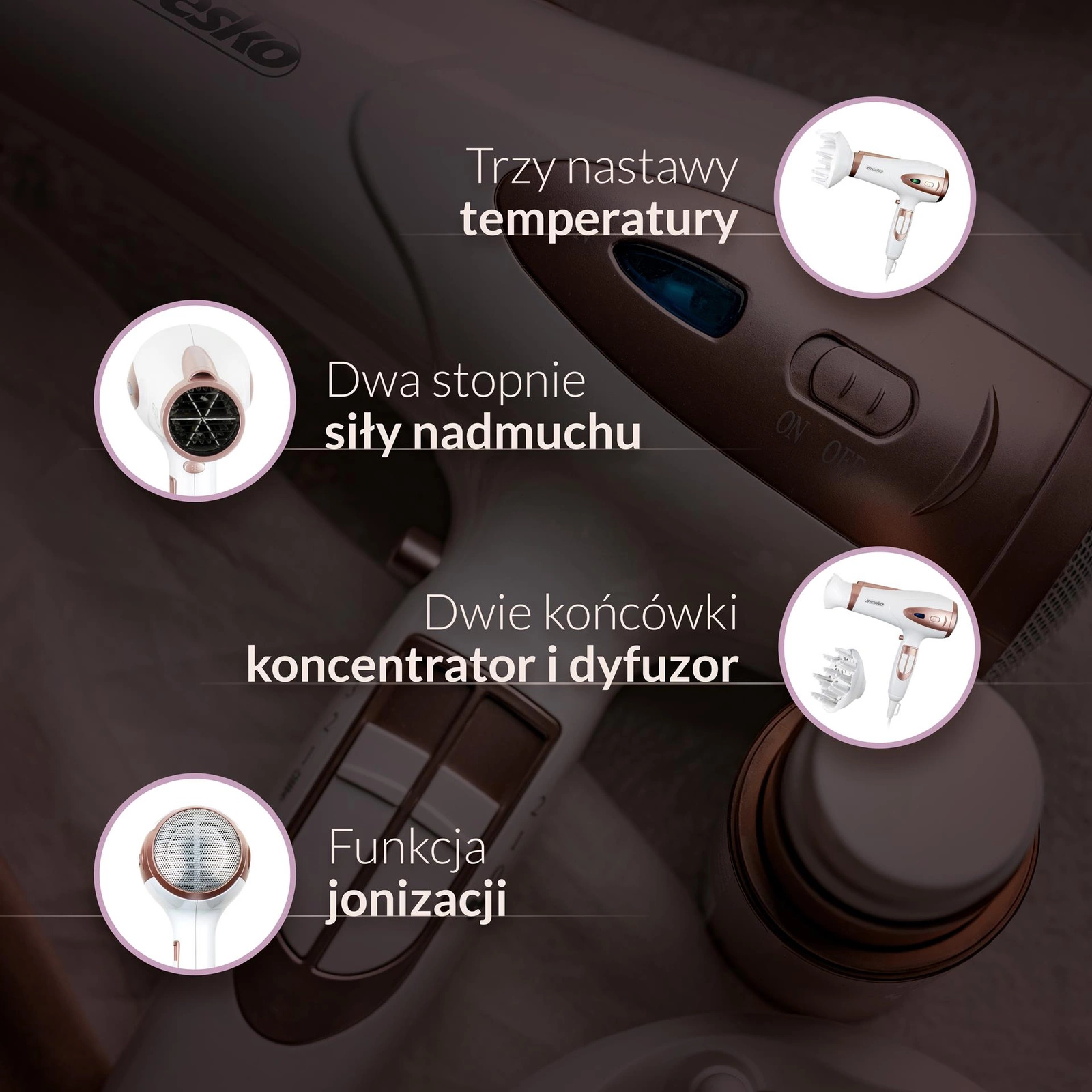 - Funkcja jonizacji: Z dedykowanym włącznikiem i lampką kontrolną, dla gładkich i lśniących włosów.