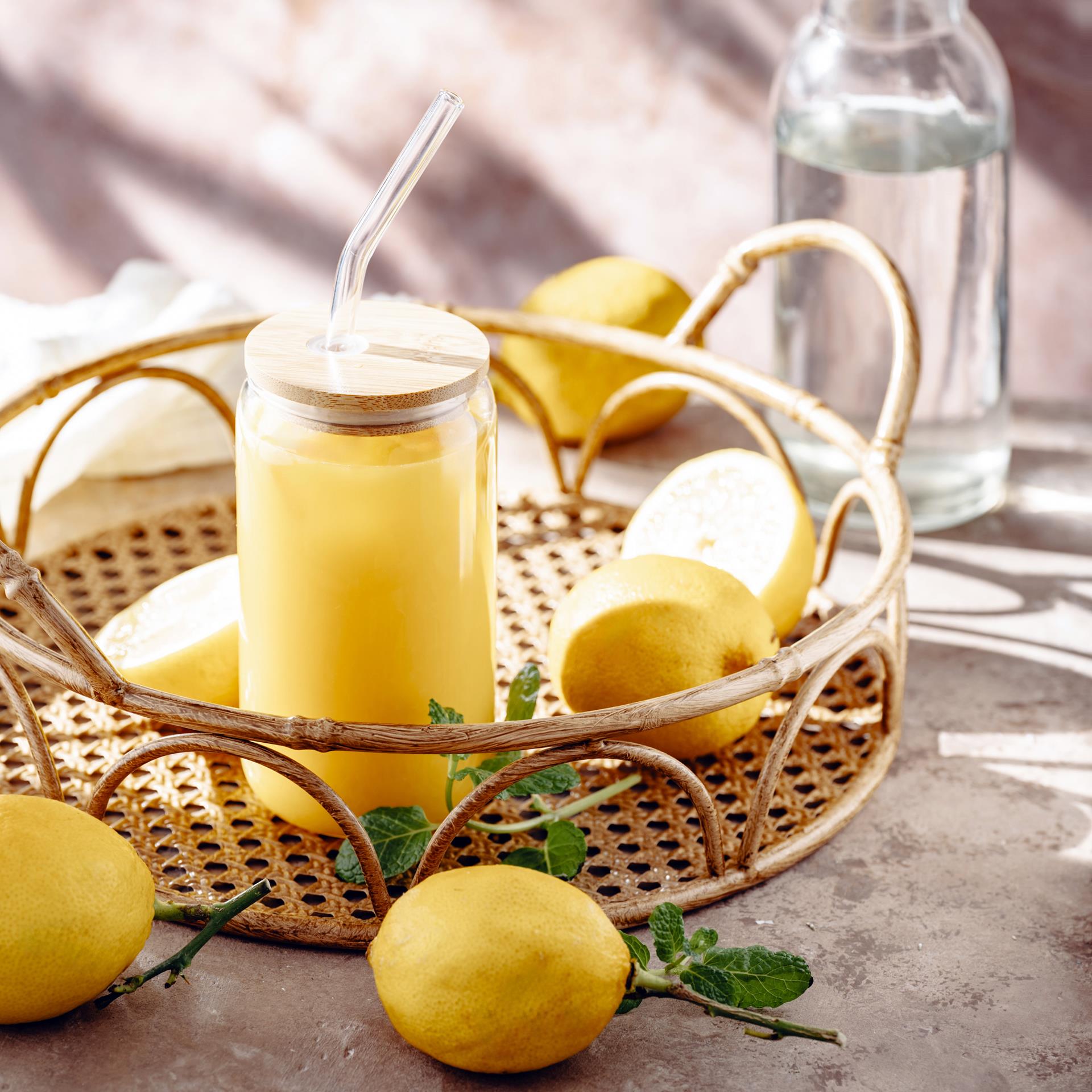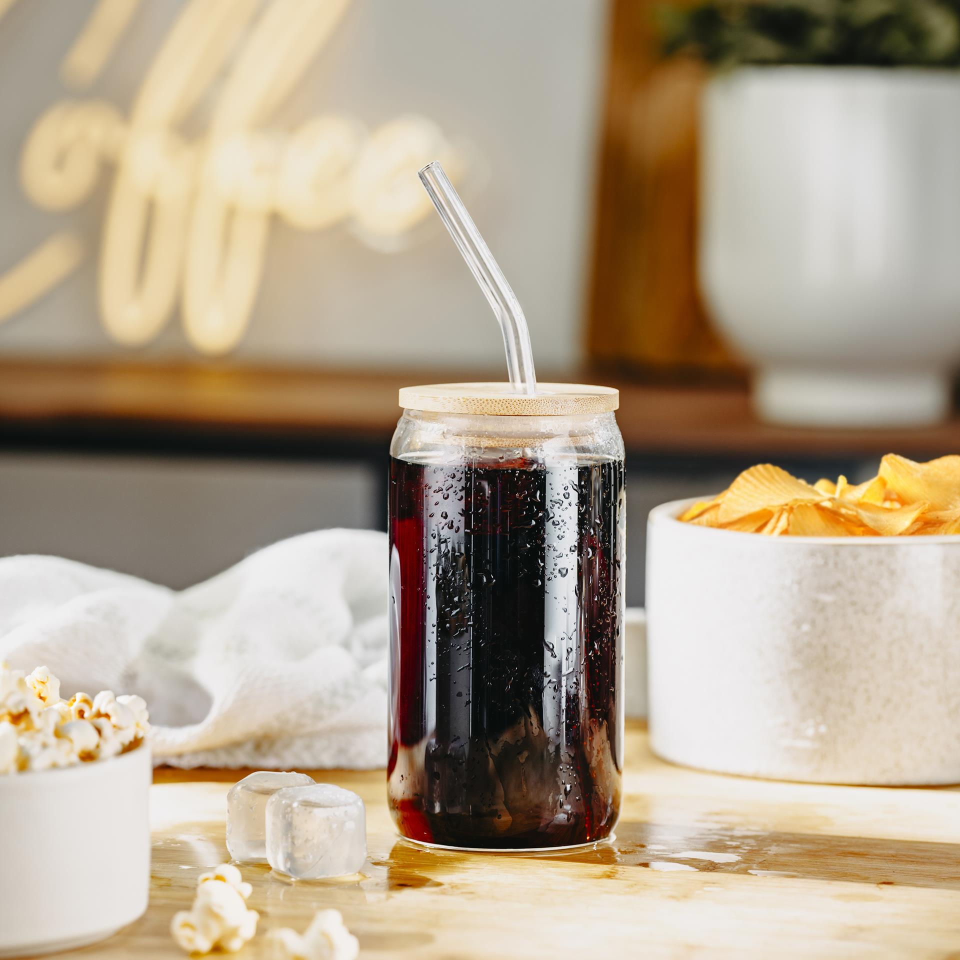 Szklany kubek 460 ml, pokrywka bambusowa, szklana słomka, ekologiczny zestaw