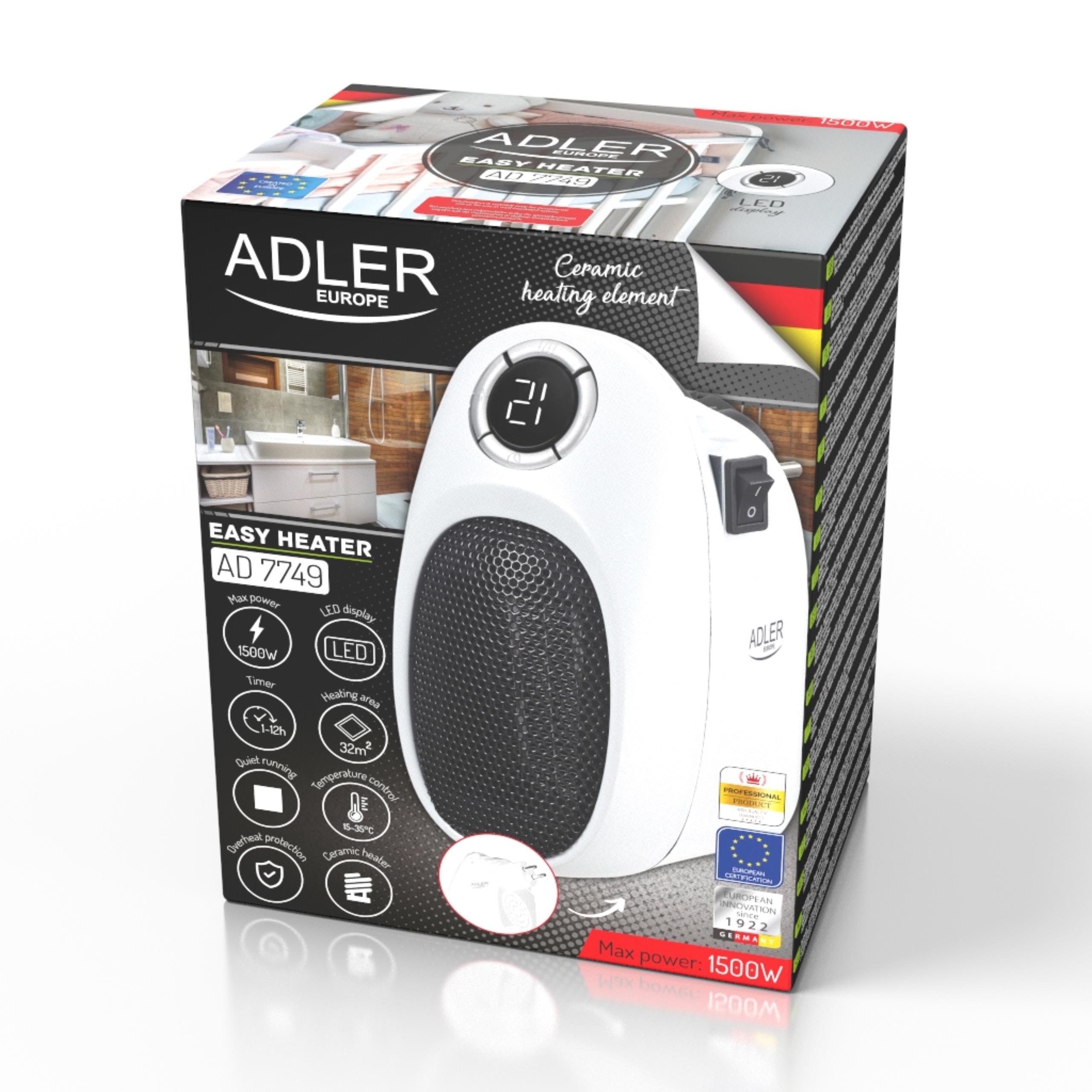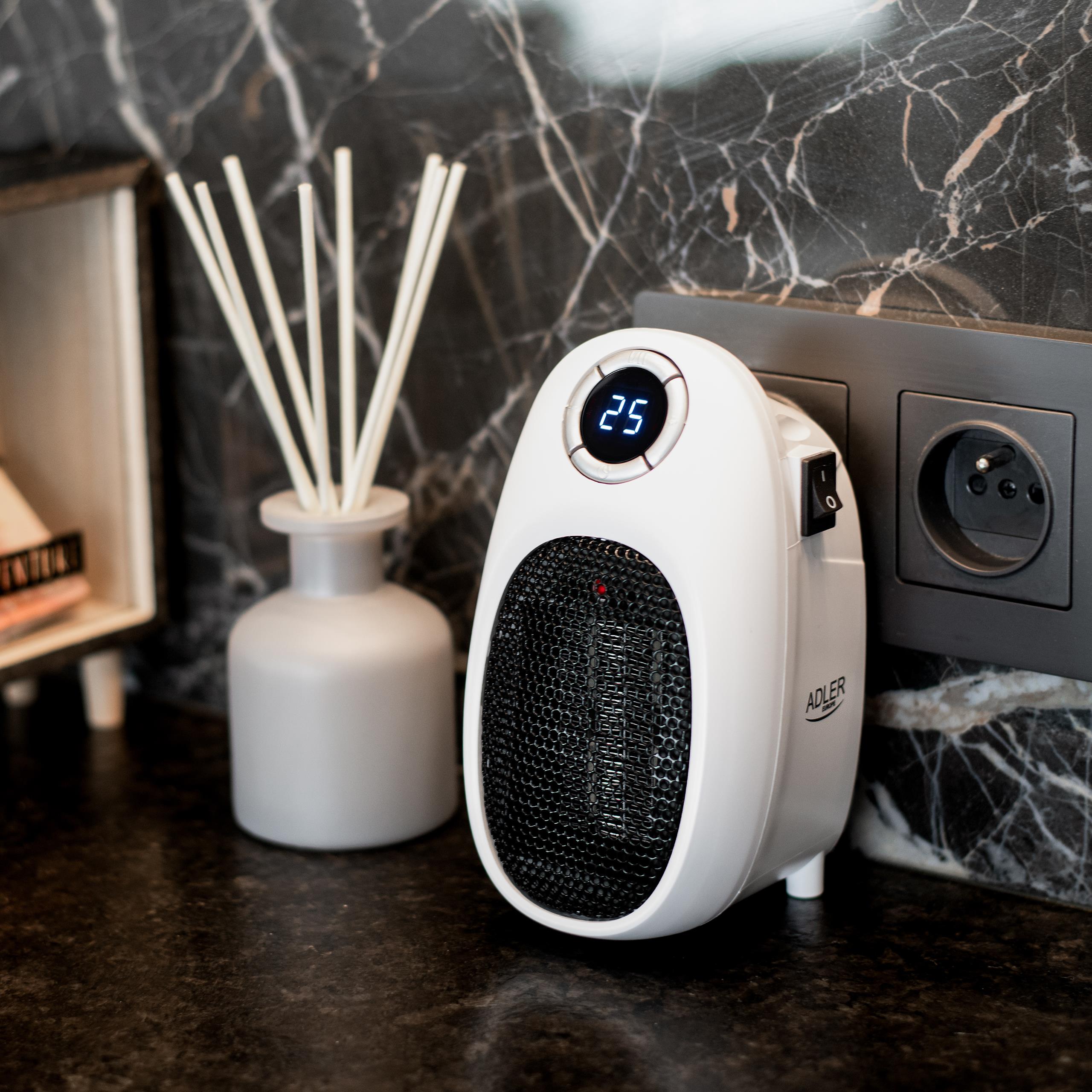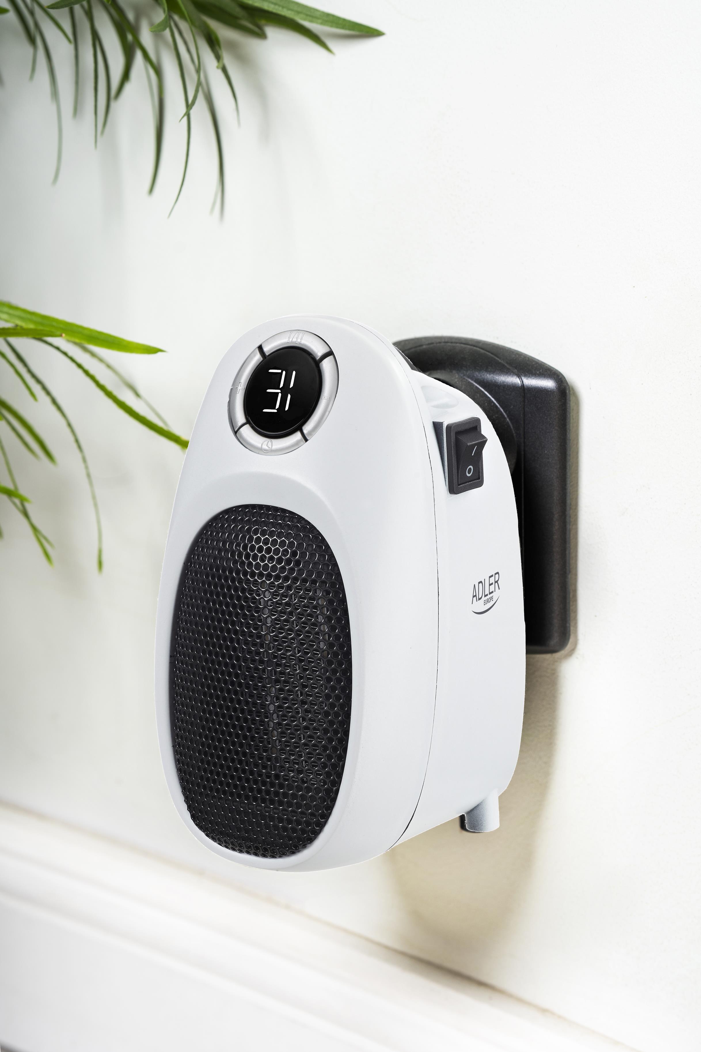 Ogrzewacz Adler o mocy maksymalnej 1500W, mimo niewielkich rozmiarów, potrafi skutecznie nagrzać pomieszczenie o powierzchni nawet 32 m2. Dzięki kompaktowej wielkości oraz brakowi zewnętrznych kabli łatwo go przechowywać (np. w szufladzie). Niezastąpiony w przypadku awarii ogrzewania lub konieczności dogrzania zbyt chłodnego pokoju. Programator pozwala na ustawienie długości (1-12 godzin) działania i regulację temperatury w zakresie od 15 do 35 stopni. Urządzenie posiada czytelny, biały cyfrowy wyświetlacz LED.