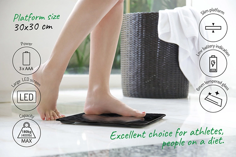 Precyzyjna elektroniczna waga łazienkowa z udźwigiem maksymalnym 180 kg. Doskonały wybór dla sportowców, osób odchudzających się i innych osób dbających o masę ciała. Wykonanie z wytrzymałego szkła hartowanego, wyposażona w antypoślizgową powierzchnię, zapewnia bezpieczeństwo użytkowania i estetyczny wygląd.