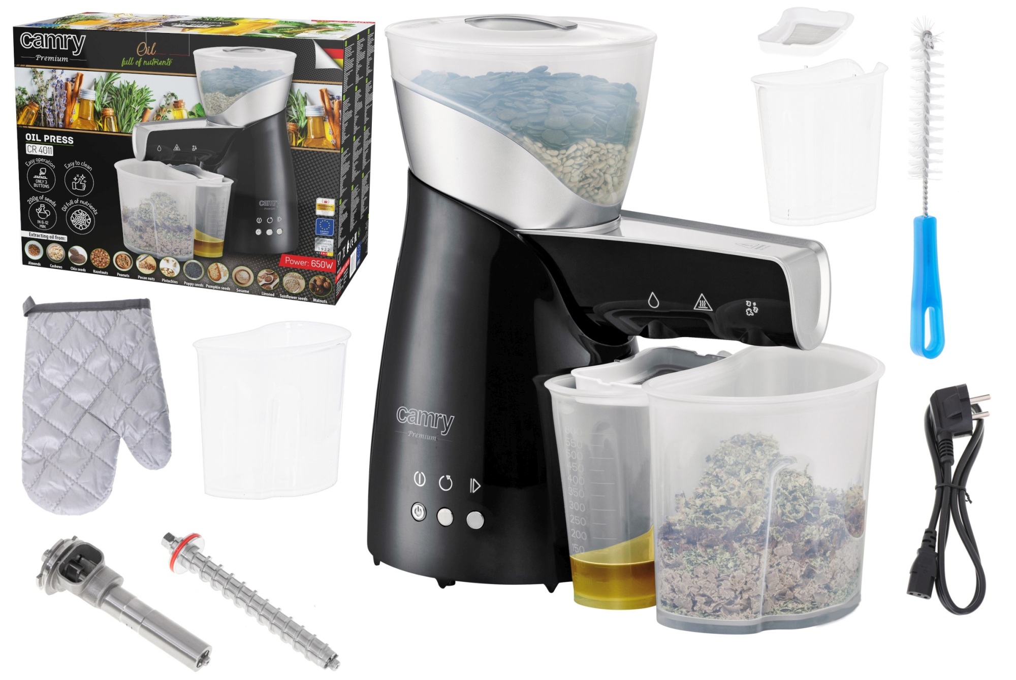 ✨W zestawie znaleźć można ślimak prasy na duże i na mniejsze nasiona, co pozwala używać większość roślin oleistych i orzechów. Dodatkowo w zestawie otrzymujemy rękawicę termiczną, szczotkę do czyszczenia i filtr do oleju.