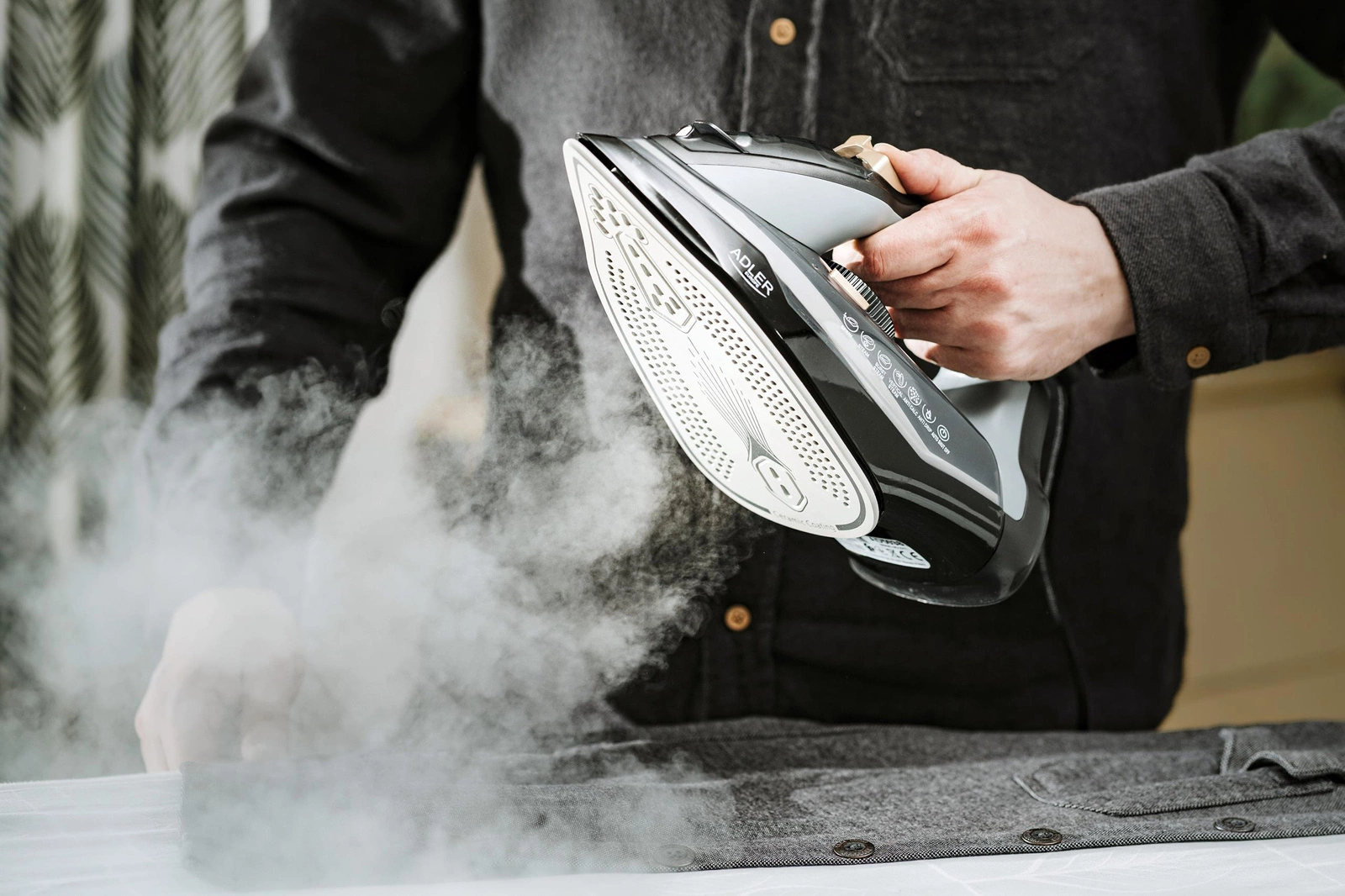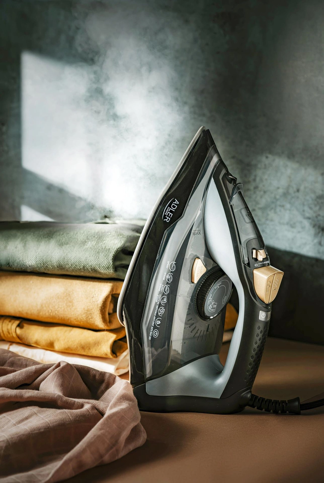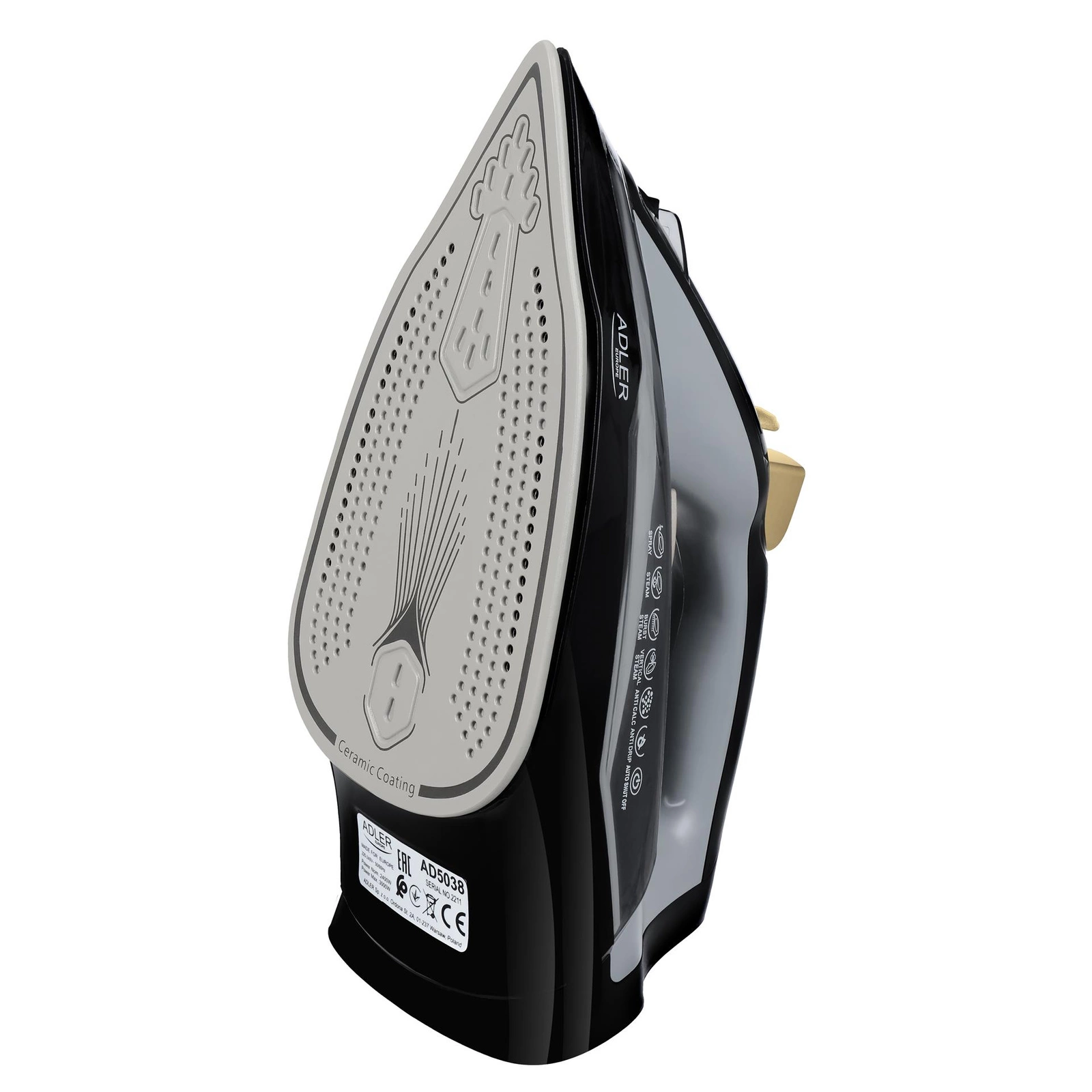 Żelazko Adler to wielofunkcyjne żelazko parowe o licznych zaletach. Żelazko ma 5 funkcji: prasuje parowo w poziomie generując 45 gram pary na minutę, prasuje parowo w poziomie z funkcją uderzenia pary do 80 gram na minutę w celu wygładzenia szczególnie opornych zagnieceń, prasuje na sucho (bez użycia pary), prasuje w pionie (np. firanki, ubrania wiszące na wieszakach: marynarki, żakiety), spełnia funkcję spryskiwacza z jednorazowym wyrzutem wody 0,5 grama. Żelazko wyposażone jest w 4 systemy: automatyczne wyłączanie w razie pozostawienia urządzenia bez nadzoru, system blokady kapania gdy temperatura płyty prasującej nie osiągnęła jeszcze optymalnej temperatury urządzenie zahamuje wypływ kropel wody zamiast pary, system anty-wapienny ograniczający osadzanie się minerałów z wody w urządzeniu, system samooczyszczenia. Dodatkowe zalety to duży zbiornik pozwalający na rzadsze dolewanie wody podczas prasowania. Spiczasta końcówka stopy ułatwia dostęp do trudno dostępnych miejsc np. wokół guzików, prasowanie plis, etc. Stopa ceramiczna zwiększa poślizg – gładkie sunięcie po tkaninie. Przewód zasilający 1,50m. Funkcja automatycznego wyłączenia odcina zasilanie żelazka po pozostawieniu go w bezruchu w pozycji pionowej po 8 minutach, w pozycji poziomej po 30 sekundach. Urządzenie sygnalizuje uruchomienie funkcji automatycznego wyłączania 6 krotnym sygnałem dźwiękowym.